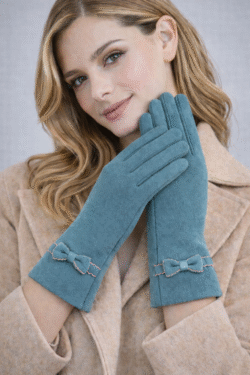 Κομψά γυναικεία γάντια σε μπλε απόχρωση με διακριτικό φιόγκο στον καρπό, ιδανικά για θηλυκές και elegant χειμερινές εμφανίσεις.