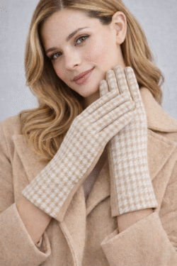 Κομψά γυναικεία γάντια σε μπεζ καρό σχέδιο, με ενιαία υφή μπροστά και πίσω, ιδανικά για elegant χειμερινές εμφανίσεις.