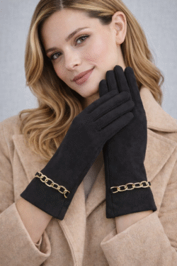 Κομψά γυναικεία μαύρα γάντια με διακοσμητική χρυσή αλυσίδα στον καρπό, ιδανικά για elegant και σύγχρονες χειμερινές εμφανίσεις.