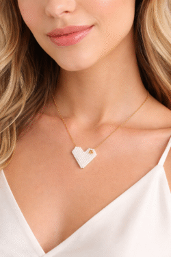 Χειροποίητο κολιέ με λευκή καρδιά από χάντρες και λεπτή χρυσή αλυσίδα. Ρομαντικό και κομψό, ιδανικό για καθημερινή χρήση ή ως δώρο.