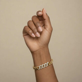 Εντυπωσιακό γυναικείο βραχιόλι αλυσίδα από ανοξείδωτο ατσάλι σε χρυσό τόνο, με κρίκους διακοσμημένους με λαμπερά ζιργκόν. Ιδανικό για glamorous εμφανίσεις.
