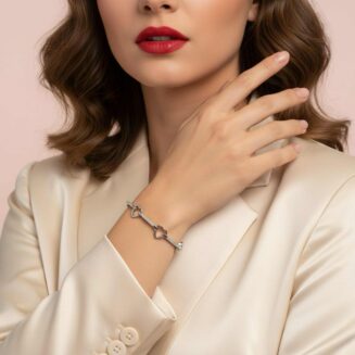 Ρομαντικό γυναικείο βραχιόλι από ανοξείδωτο ατσάλι σε ασημί απόχρωση, με καρδιές και λαμπερές λεπτομέρειες ζιργκόν. Ιδανικό για καθημερινή κομψότητα.