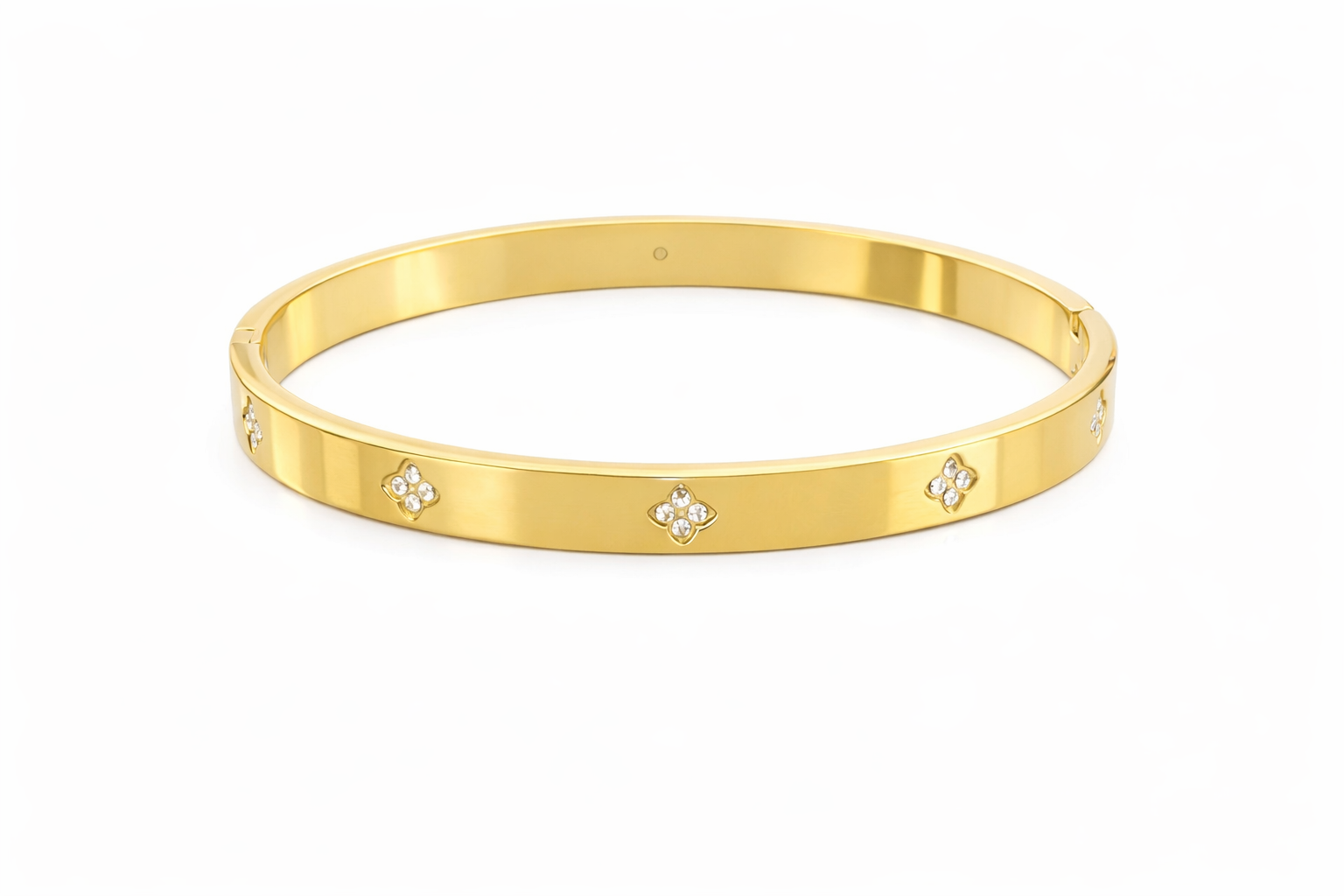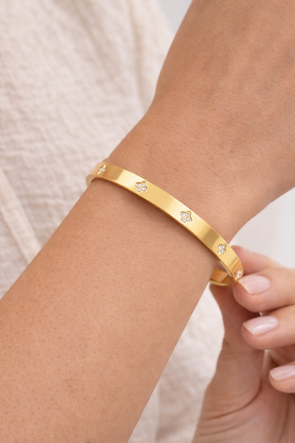 Κομψό και διαχρονικό χρυσό βραχιόλι με λεπτό, minimal σχεδιασμό και διακριτικά τετράφυλλα μοτίφ, διακοσμημένα με λαμπερές πέτρες που χαρίζουν διακριτική λάμψη. Η γυαλιστερή επιφάνειά του αναδεικνύει την πολυτέλεια του κοσμήματος, ενώ ο κλασικός σχεδιασμός του το καθιστά ιδανικό για κάθε περίσταση. Φοριέται άνετα μόνο του για elegant αποτέλεσμα ή συνδυάζεται με άλλα βραχιόλια για πιο statement εμφανίσεις. Ένα κόσμημα που προσθέτει φινέτσα, θηλυκότητα και κομψότητα σε κάθε look.