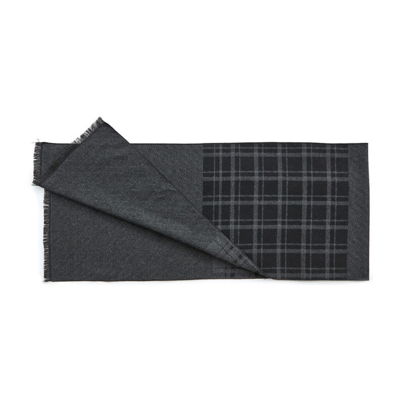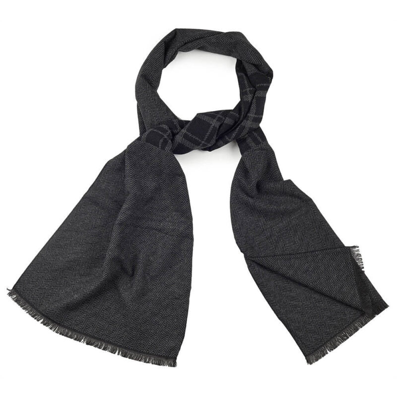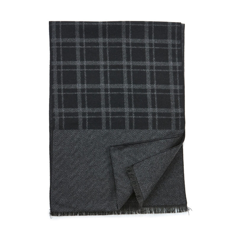 Ανδρικό κασκόλ μαύρο/γκρι με καρό σχέδιο και ζικ ζακ υφή. Ζεστό, κομψό και ιδανικό για χειμερινές εμφανίσεις.