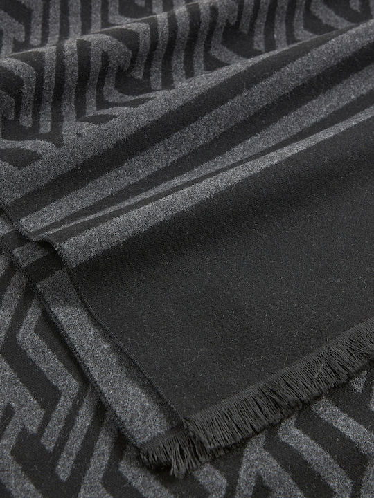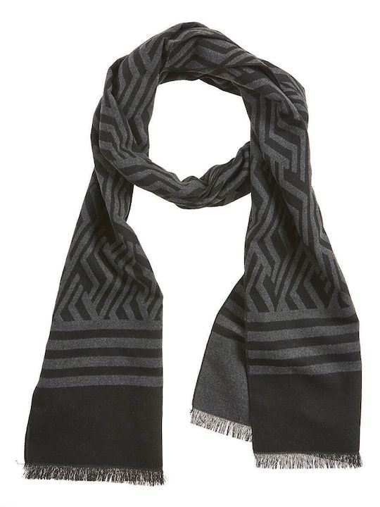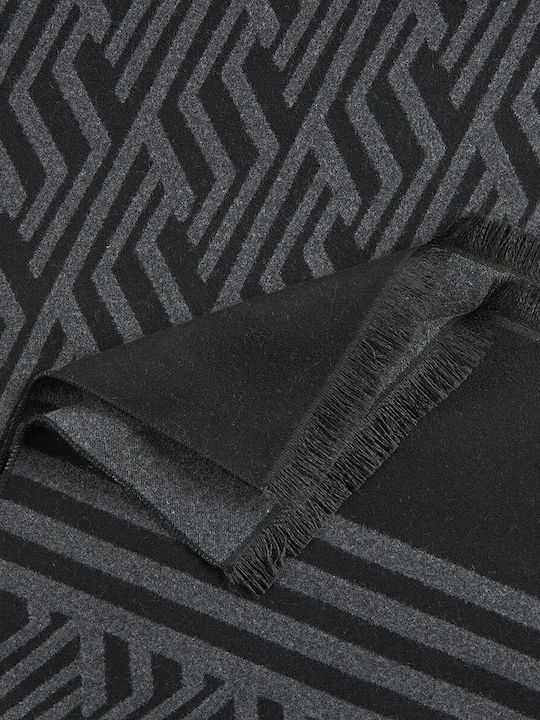 Ανδρικό κασκόλ μαύρο/γκρι με γεωμετρικό σχέδιο, ρίγες και κρόσσια. Ζεστό και κομψό για χειμερινές εμφανίσεις.