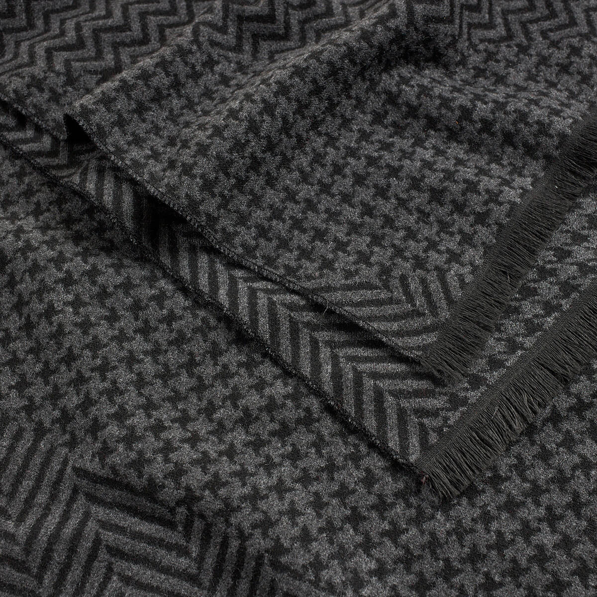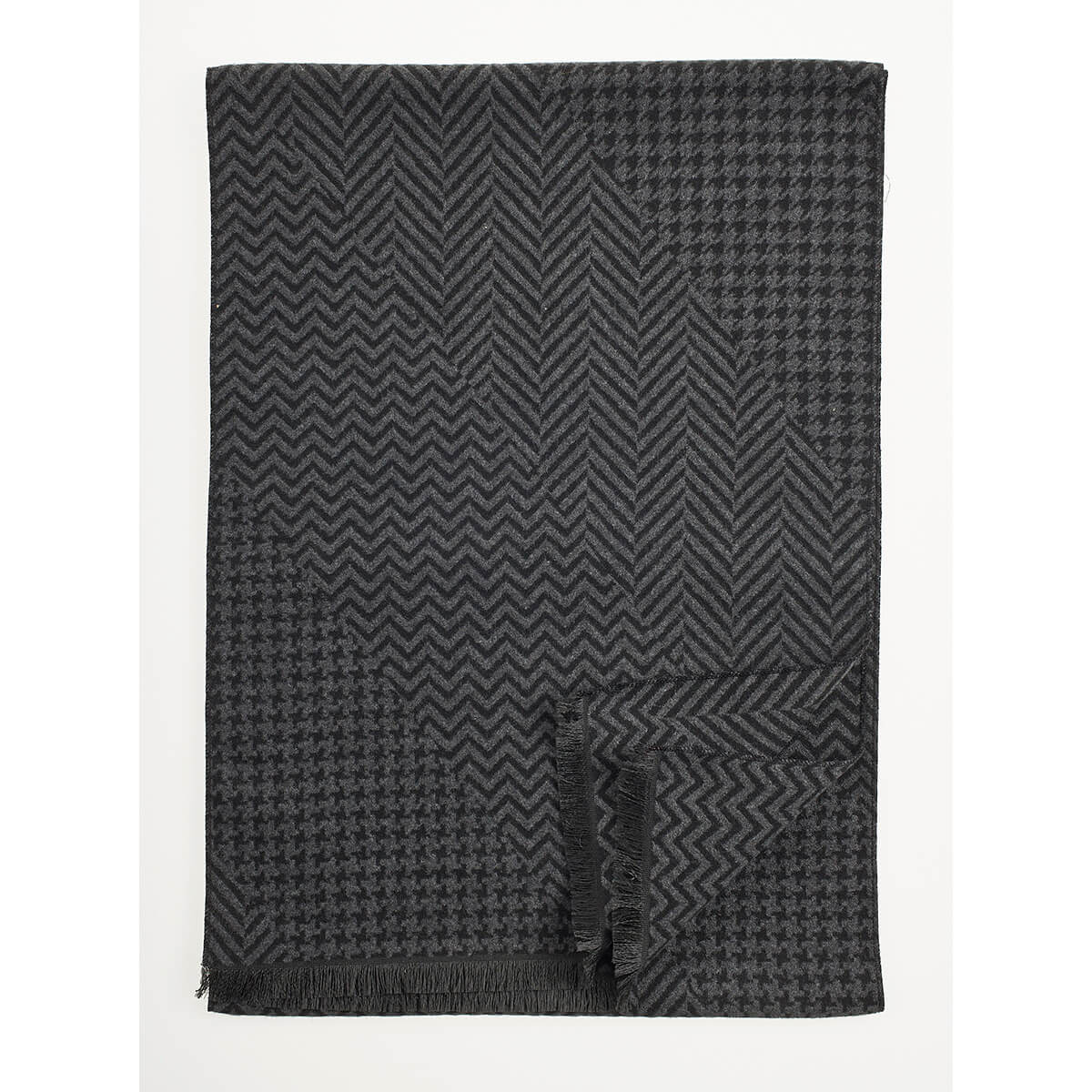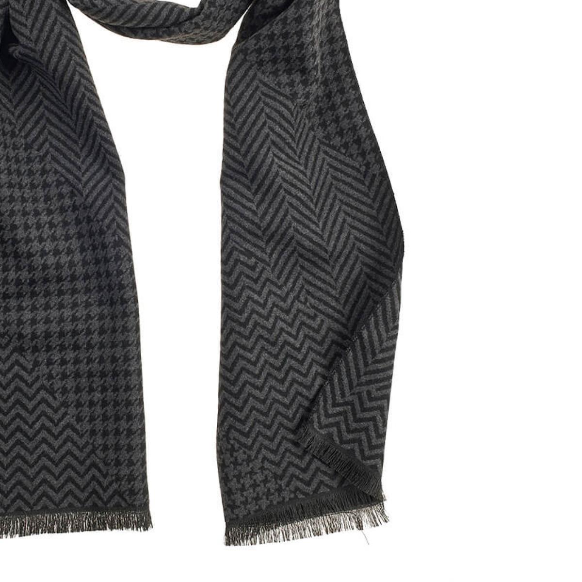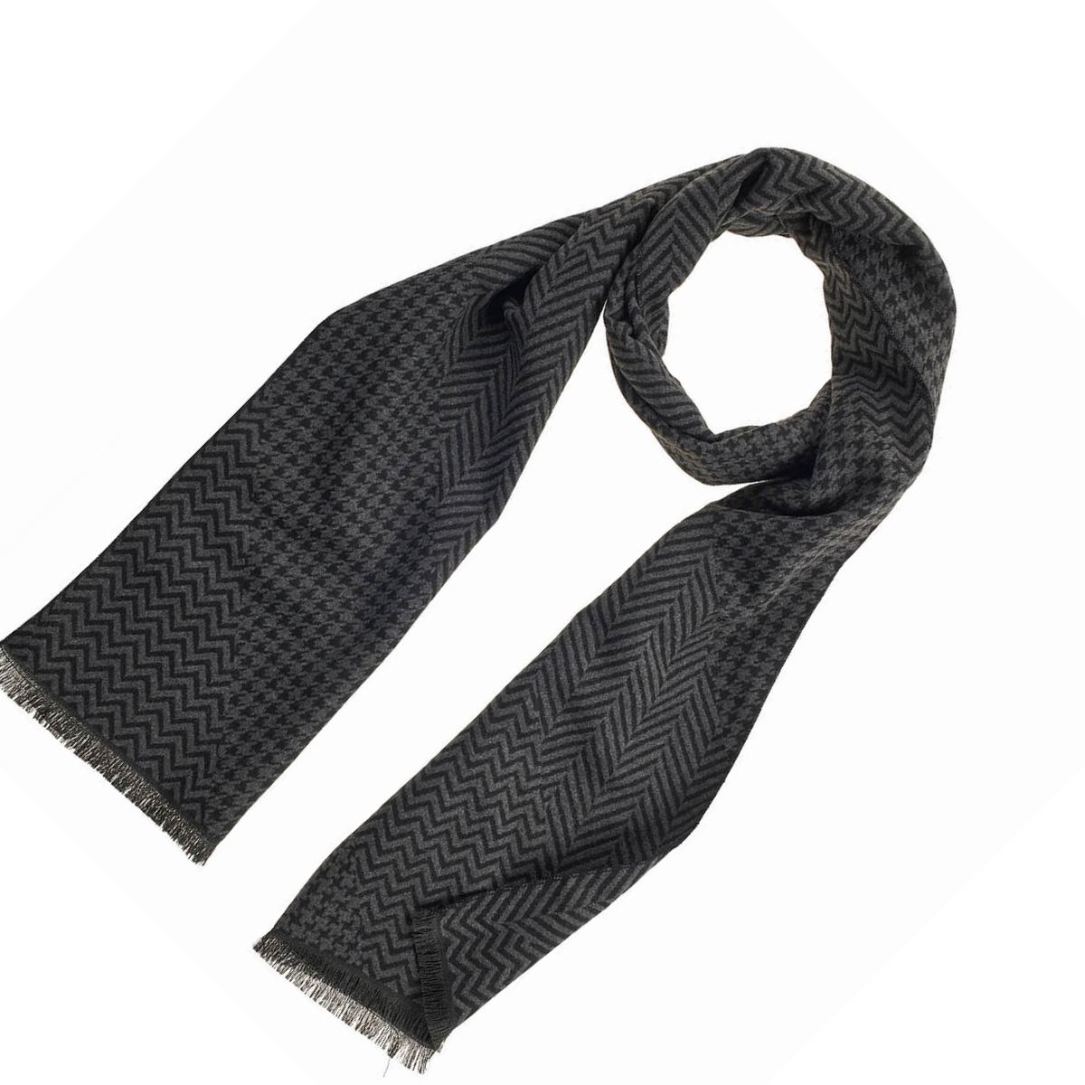 Ανδρικό κασκόλ σε γκρι αποχρώσεις με σχέδιο ζικ ζακ και καρό, ιδανικό για ζεστασιά και στυλ τον χειμώνα.