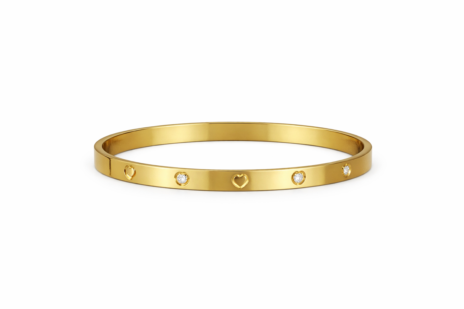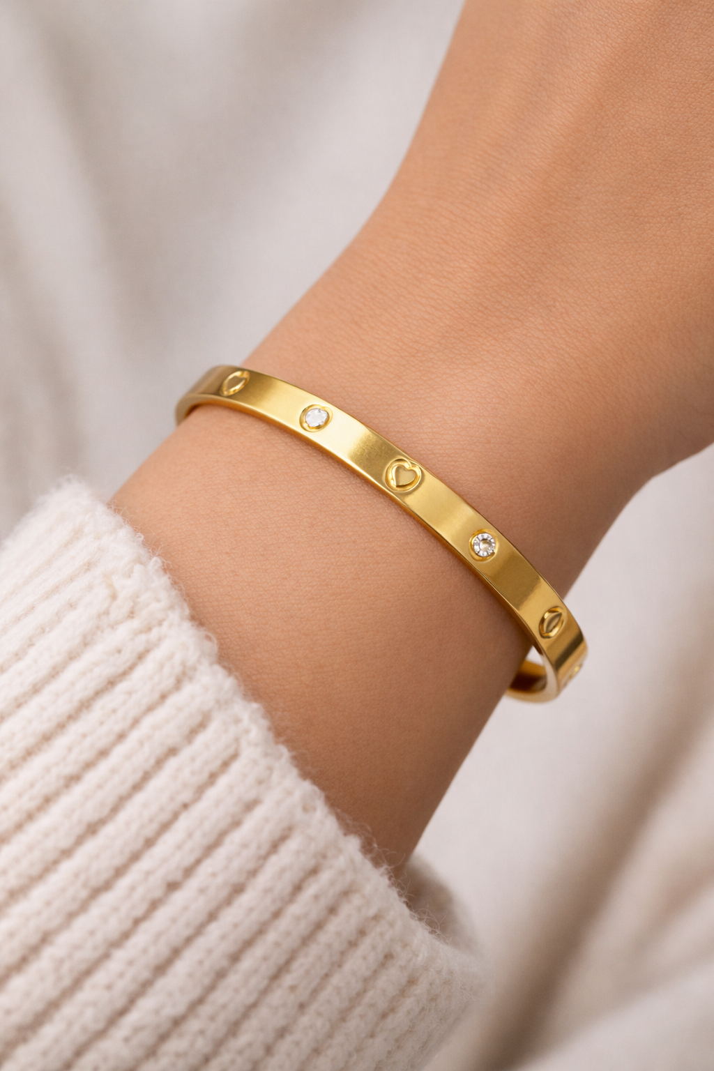 Κομψό χρυσό βραχιόλι cuff με minimal αισθητική και ρομαντικές λεπτομέρειες, σχεδιασμένο για να φοριέται καθημερινά αλλά και σε πιο ιδιαίτερες εμφανίσεις. Διακοσμημένο με διακριτικά μοτίβα καρδιάς και λαμπερές λευκές πέτρες, προσθέτει μια θηλυκή και elegant πινελιά σε κάθε look.