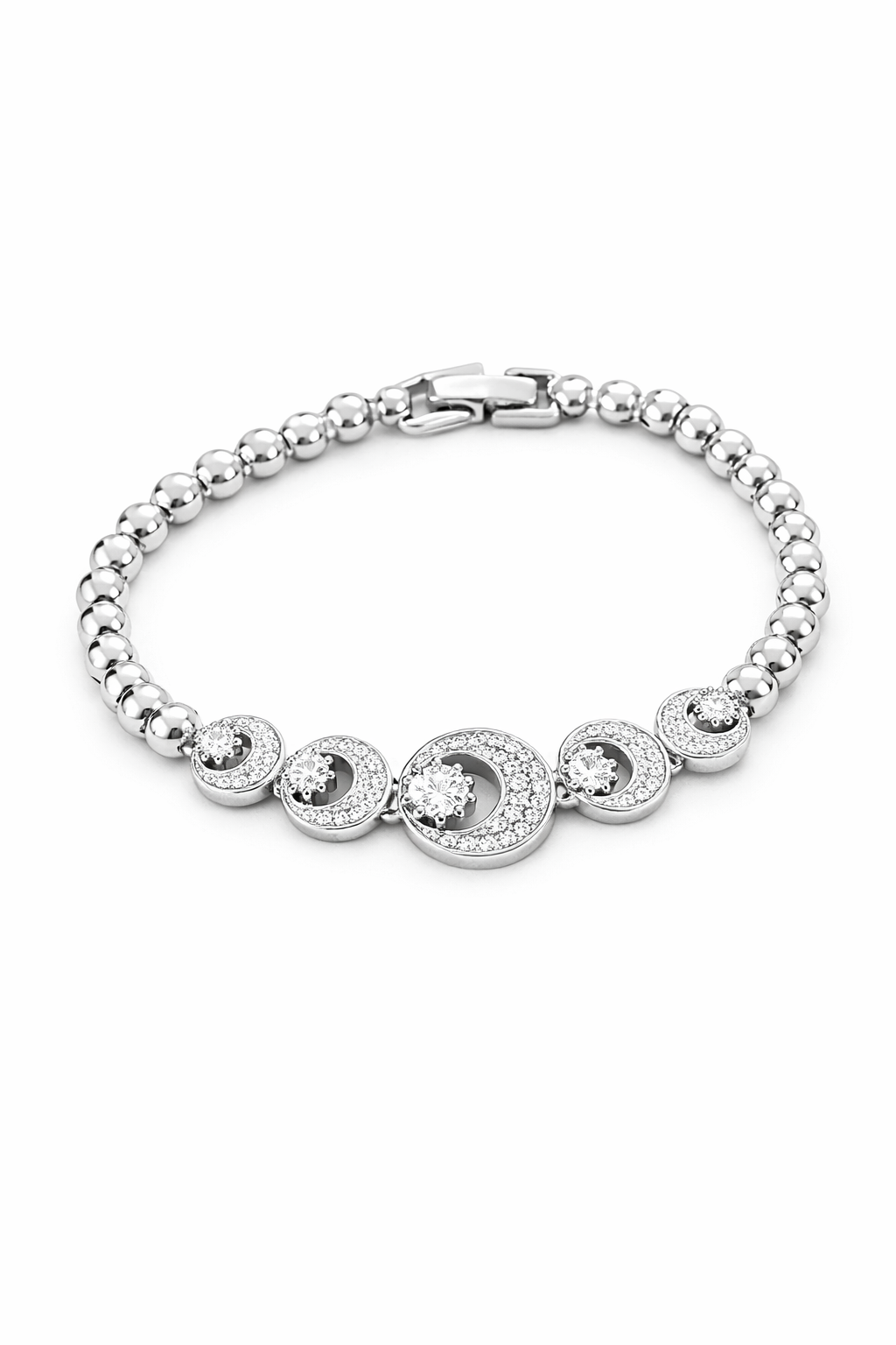 Κομψό ατσάλινο βραχιόλι σε ασημί και χρυσή απόχρωση με γυαλιστερές σφαιρικές χάντρες και εντυπωσιακό κεντρικό σχέδιο από πέντε κυκλικά μοτίβα διακοσμημένα με λαμπερά ζιργκόν. Κατασκευασμένο από ανοξείδωτο ατσάλι υψηλής ποιότητας, ανθεκτικό στη φθορά και στο μαύρισμα, ιδανικό για καθημερινή χρήση αλλά και για πιο ιδιαίτερες εμφανίσεις. Το ασφαλές κούμπωμα προσφέρει άνετη και σταθερή εφαρμογή στον καρπό. Ένα διαχρονικό κόσμημα που συνδυάζει κομψότητα, λάμψη και αντοχή, κατάλληλο και ως δώρο.