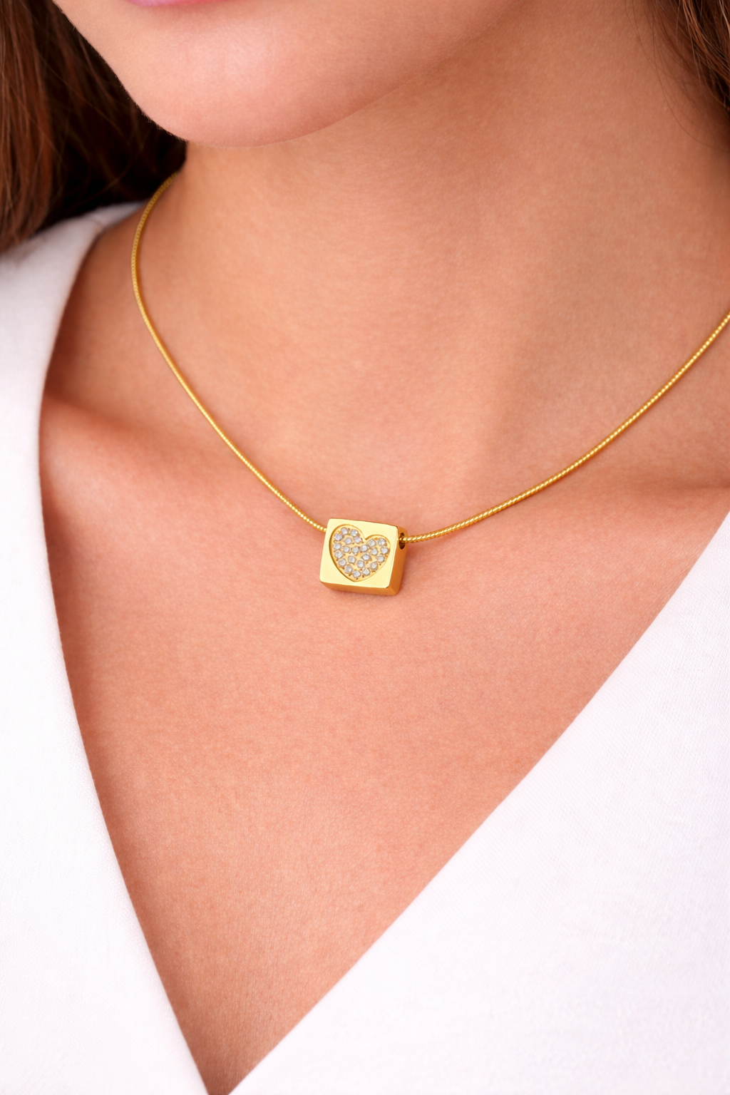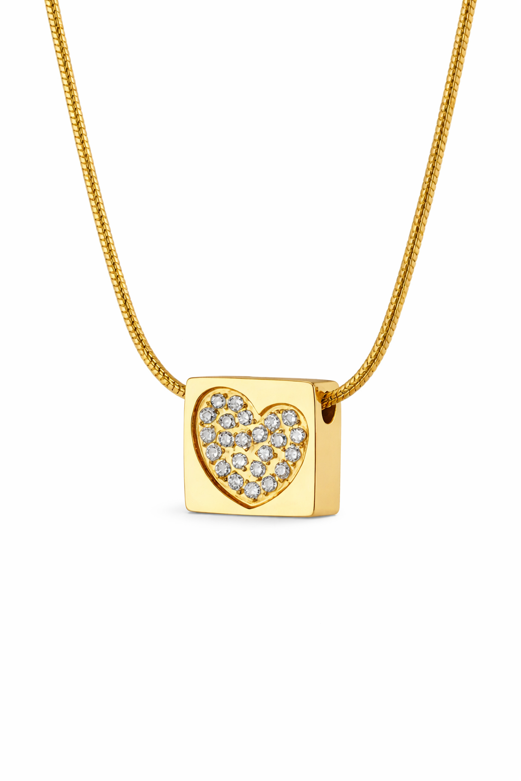 Κομψό γυναικείο κολιέ σε χρυσό χρώμα με τετράγωνο μενταγιόν διακοσμημένο με καρδιά από λαμπερά κρύσταλλα. Ένα μοντέρνο και διακριτικό κόσμημα που χαρίζει λάμψη σε κάθε εμφάνιση και αποτελεί ιδανική επιλογή για καθημερινό στυλ ή για ένα όμορφο δώρο.