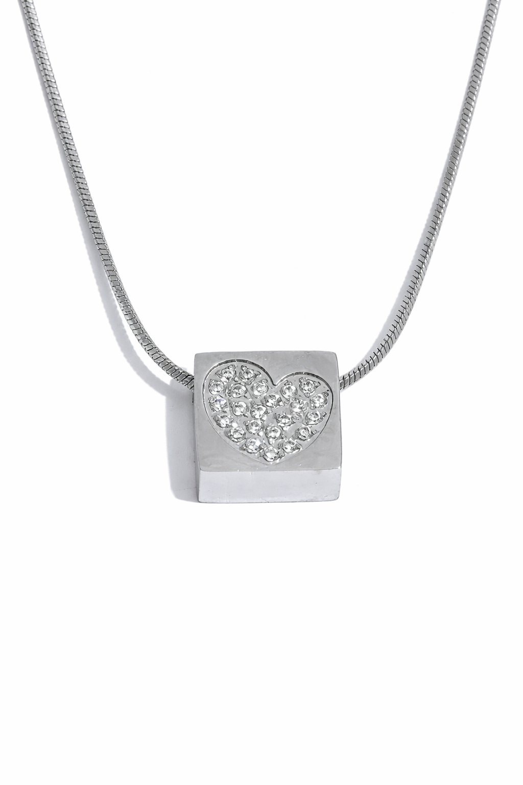 Κομψό ασημί κολιέ με μοντέρνο τετράγωνο μενταγιόν διακοσμημένο με λαμπερή καρδιά από κρύσταλλα. Ένα διακριτικό αλλά εντυπωσιακό κόσμημα που ταιριάζει ιδανικά τόσο για καθημερινή χρήση όσο και για ιδιαίτερες εμφανίσεις.