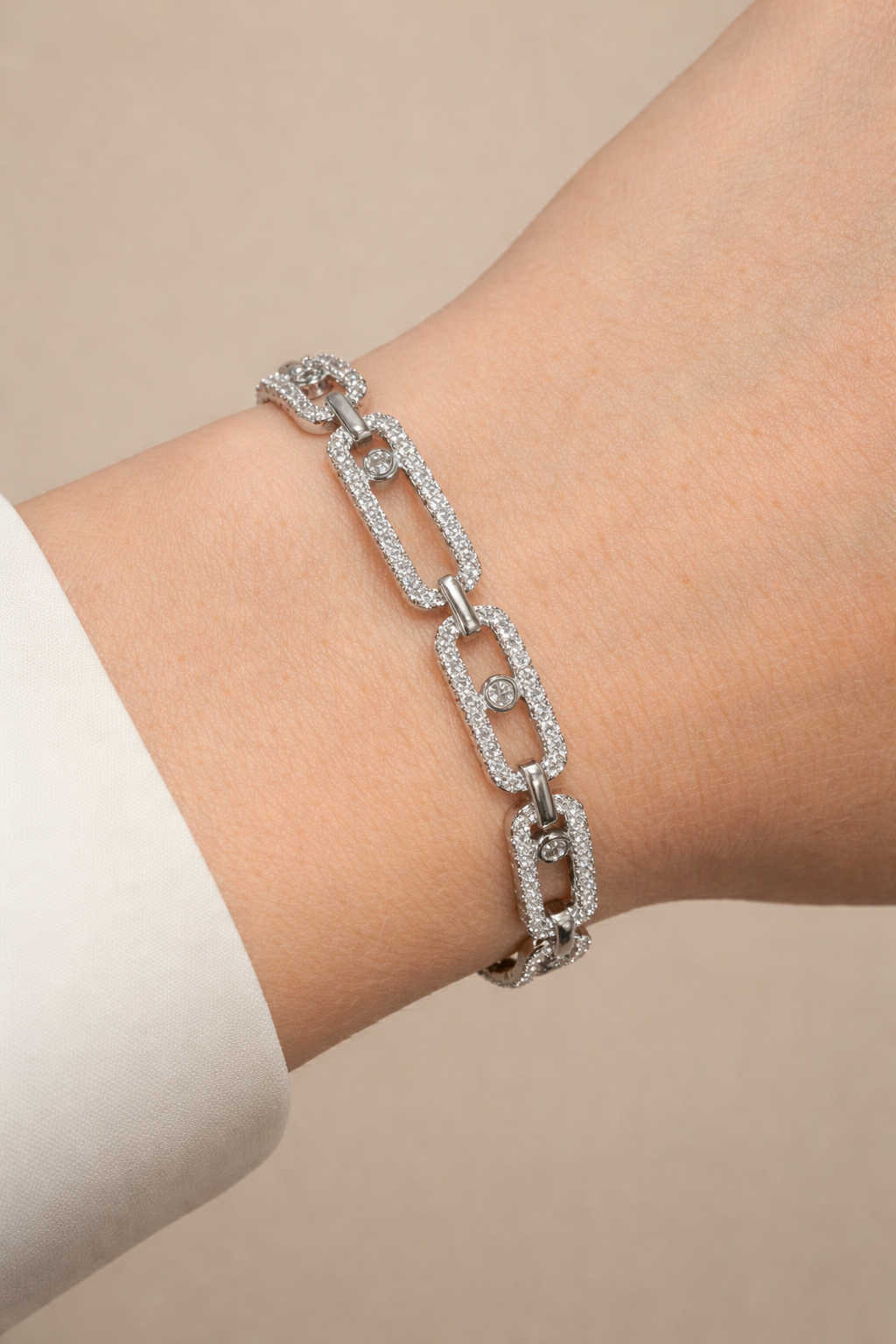 Το σχέδιό του αποτελείται από κομψούς ορθογώνιους κρίκους, διακοσμημένους με λαμπερές πέτρες ζιργκόν, δημιουργώντας ένα sophisticated αποτέλεσμα που ξεχωρίζει στον καρπό. Η ασημί απόχρωση προσφέρει διαχρονική φινέτσα και ταιριάζει εύκολα με κάθε outfit.