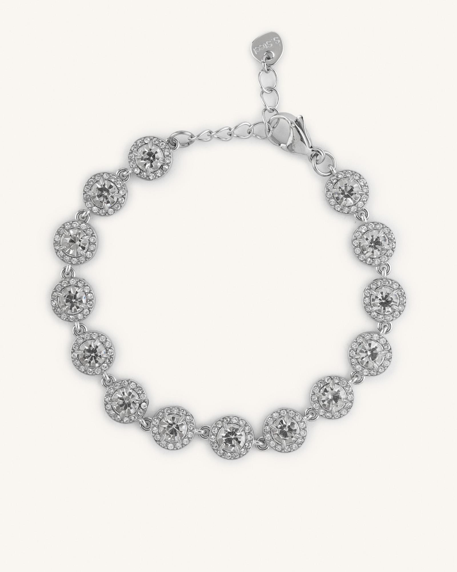 Ασημί βραχιόλι με στρογγυλές πέτρες και λευκά κρύσταλλα, που χαρίζει λάμψη και κομψότητα σε κάθε εμφάνιση. Διαχρονικό και εύκολο να συνδυαστεί.