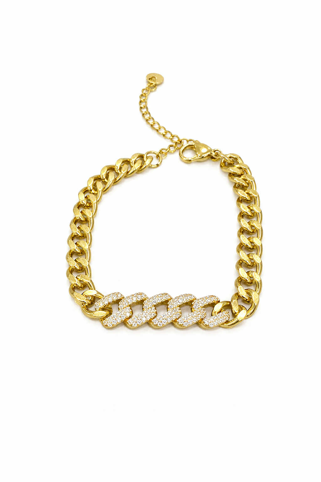 Εντυπωσιακό γυναικείο βραχιόλι αλυσίδα από ανοξείδωτο ατσάλι σε χρυσό τόνο, με κρίκους διακοσμημένους με λαμπερά ζιργκόν. Ιδανικό για glamorous εμφανίσεις.