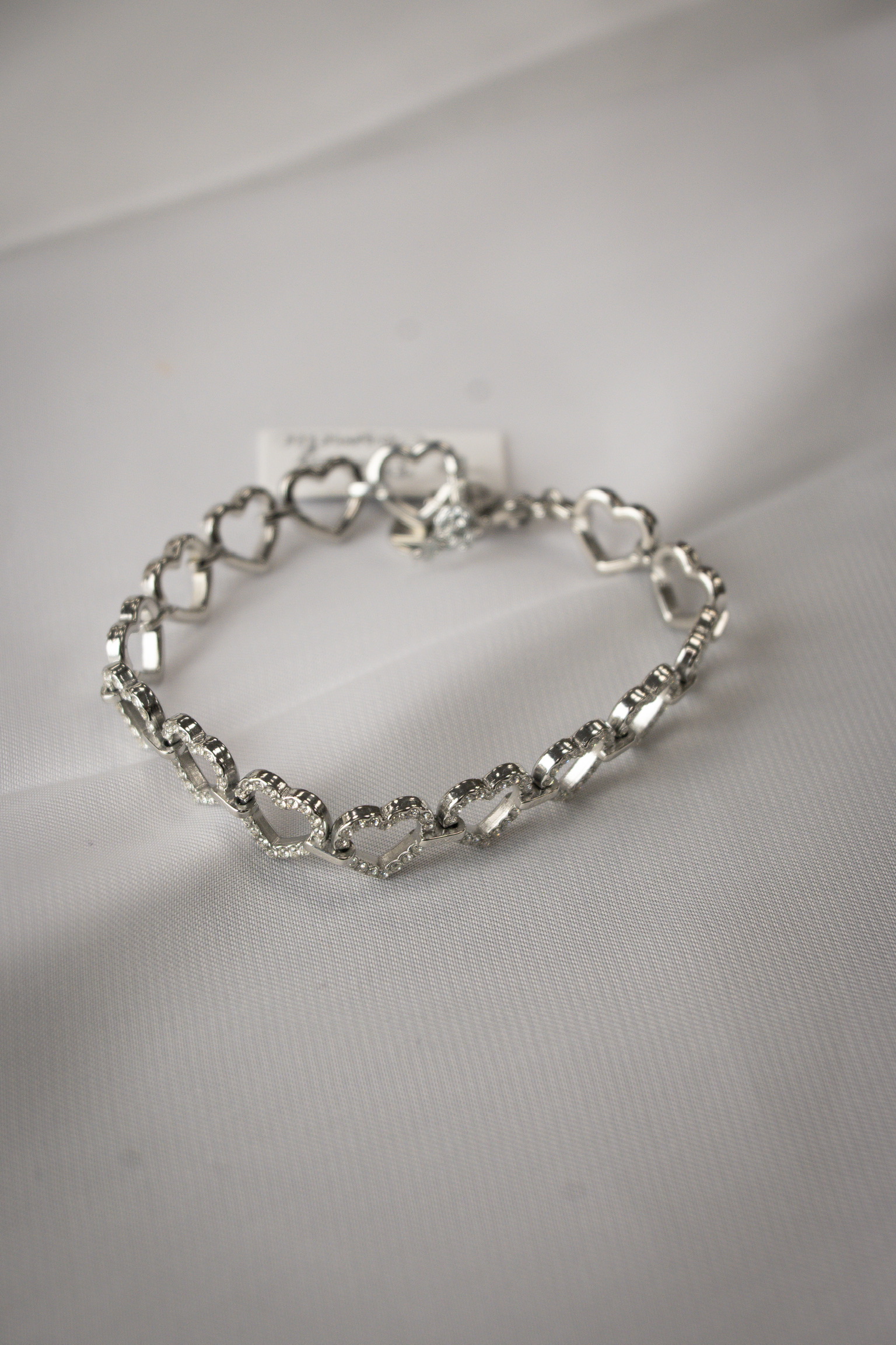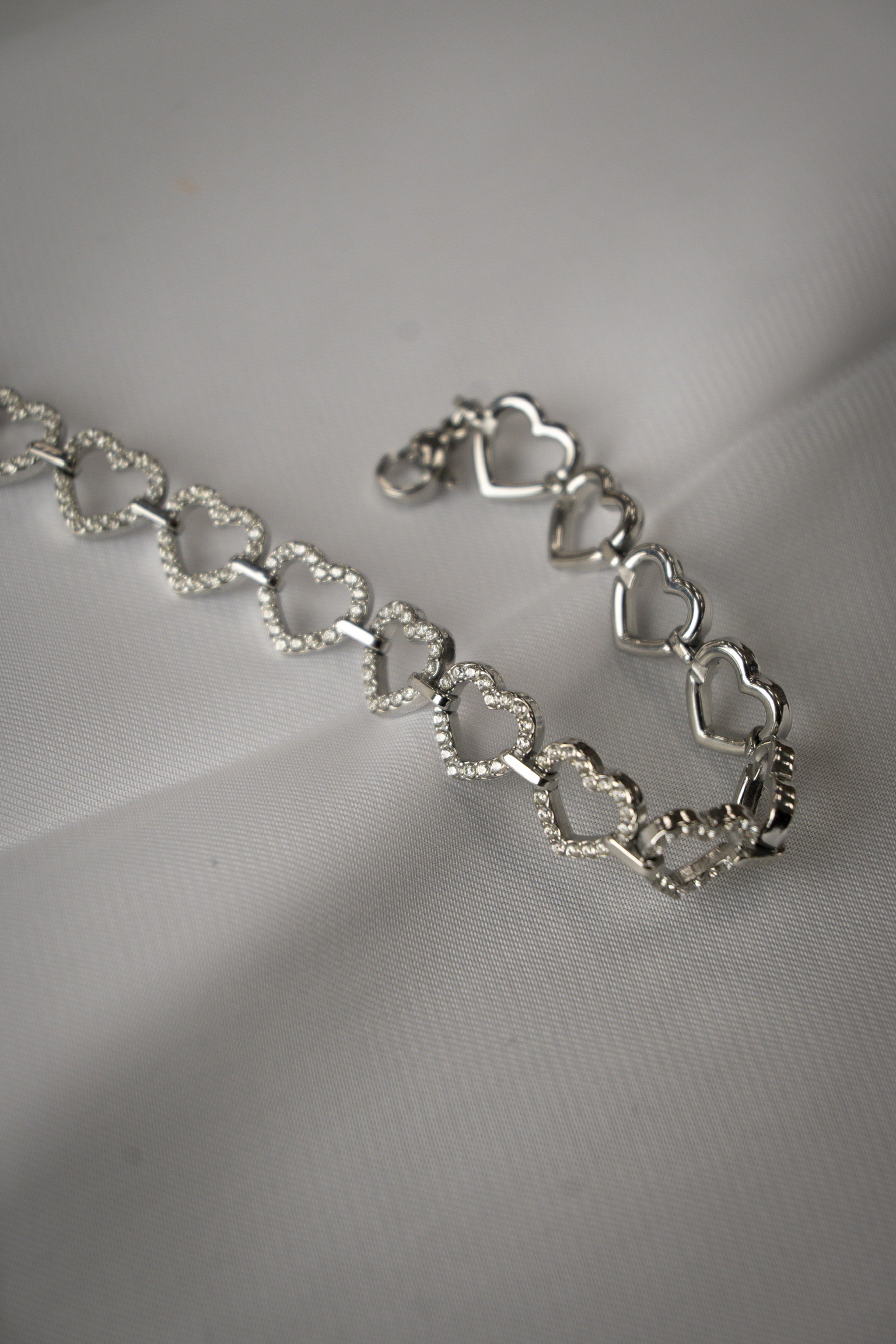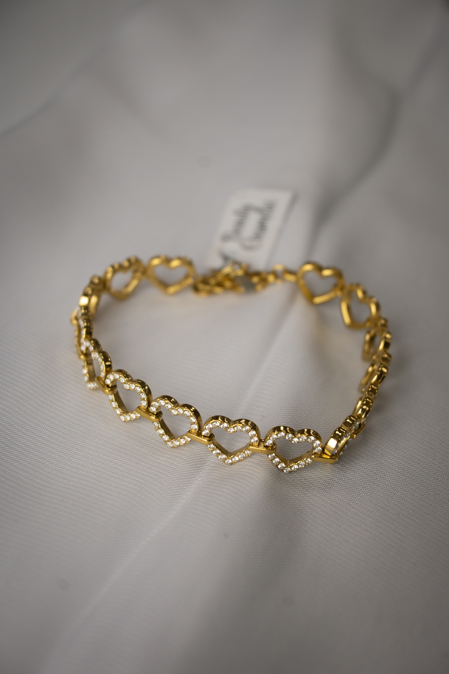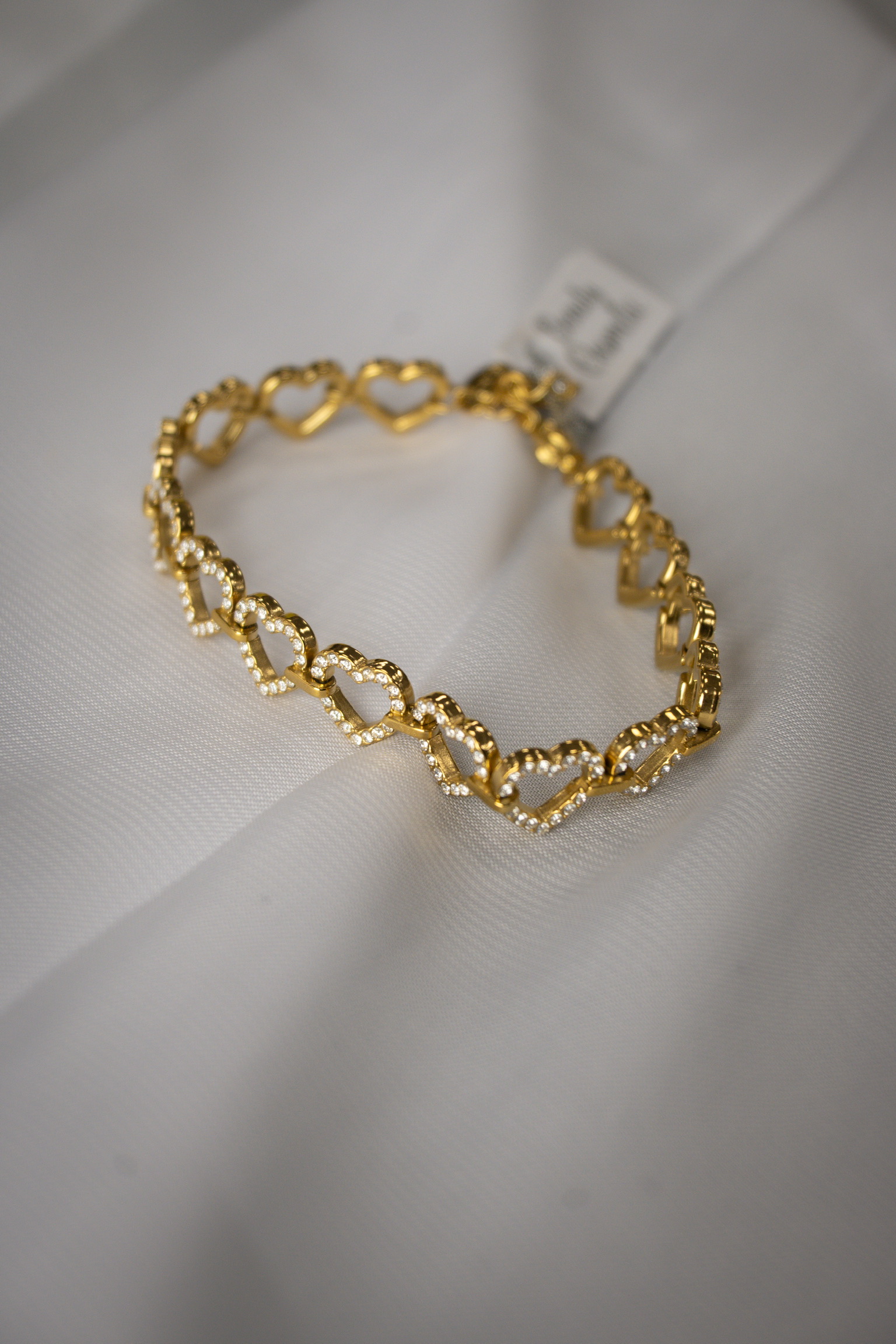 Αναδείξτε τη ρομαντική πλευρά του στυλ σας με αυτό το εντυπωσιακό βραχιόλι καρδιές, διακοσμημένο με λαμπερά στρας που χαρίζουν διακριτική πολυτέλεια σε κάθε εμφάνιση. Το σχέδιο με τις συνεχόμενες καρδιές δημιουργεί ένα κομψό αποτέλεσμα, ιδανικό για καθημερινή χρήση αλλά και για πιο ιδιαίτερες περιστάσεις.