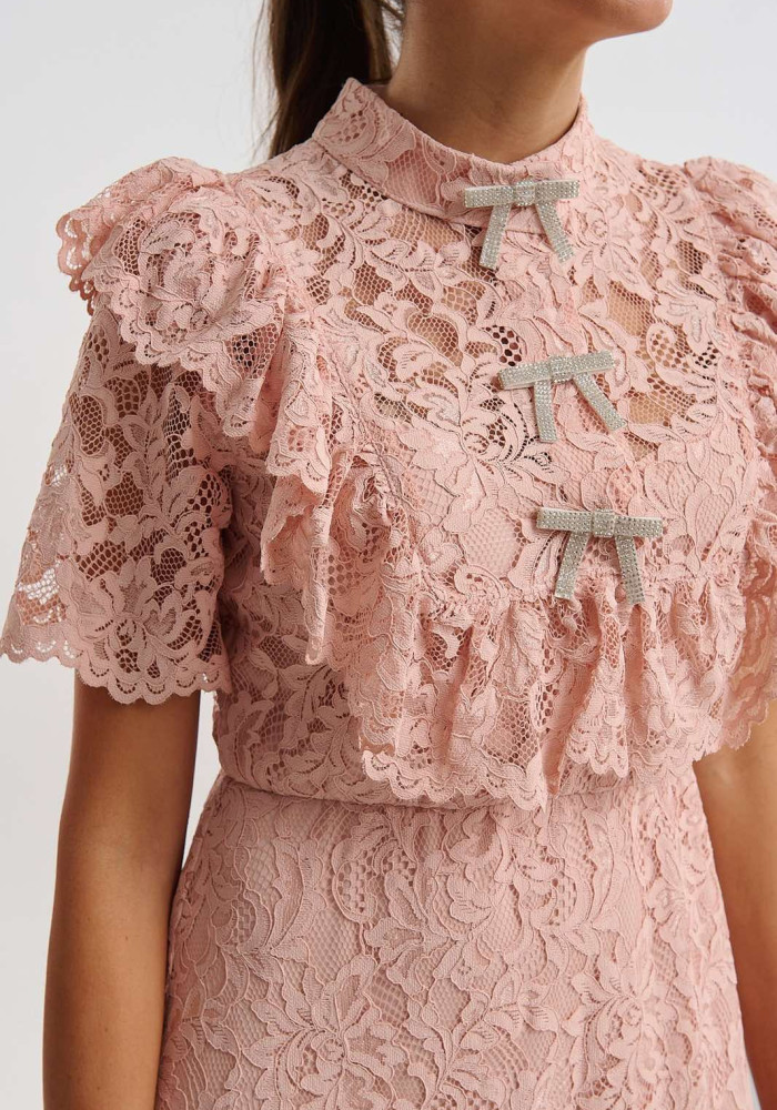 Ρομαντικό midi δαντελένιο φόρεμα από τη brigitte boutique με διακοσμητικούς φιόγκους και θηλυκή γραμμή. Ιδανικό για elegant και επίσημες εμφανίσεις.