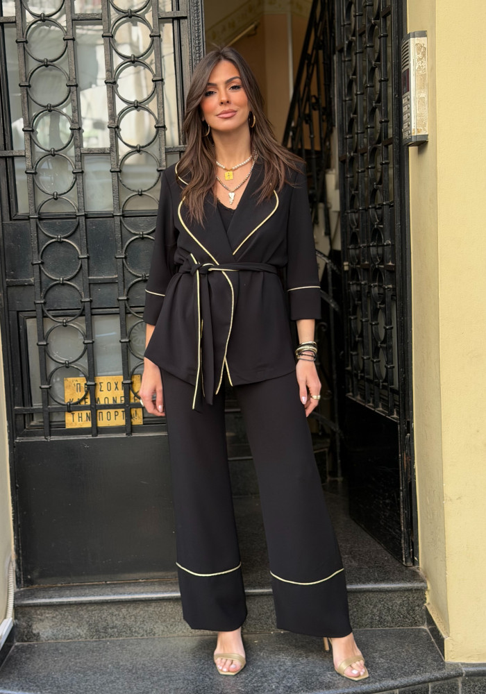 Elegant και διαχρονικό σετ από τη brigitte boutique, ιδανικό για γυναίκες που αγαπούν το sophisticated minimal στυλ με μοντέρνες λεπτομέρειες. Το σακάκι με πέτο και ζώνη στη μέση αναδεικνύει τη σιλουέτα, προσφέροντας θηλυκή και κομψή εφαρμογή. Οι διακριτικές λεπτομέρειες με ρέλι σε αντίθεση δημιουργούν ένα refined αποτέλεσμα που προσδίδει πολυτέλεια και σύγχρονη αισθητική στο σύνολο.