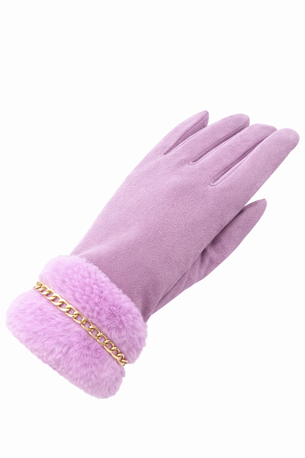 Κομψά γυναικεία γάντια σε λιλά απόχρωση με γούνινη μανσέτα και χρυσή αλυσίδα στον καρπό. Ιδανικά για stylish χειμερινές εμφανίσεις.