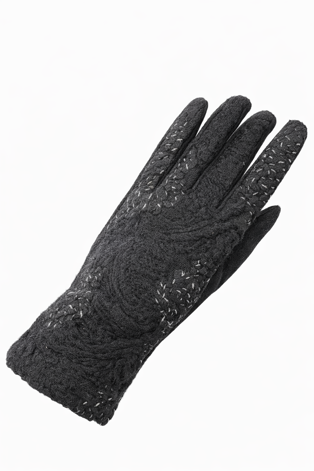 Πλεκτά γυναικεία γάντια σε μαύρο χρώμα με ανάγλυφο σχέδιο και ασπρόμαυρες λεπτομέρειες. Ζεστά, άνετα και κομψά για καθημερινή χειμερινή χρήση.