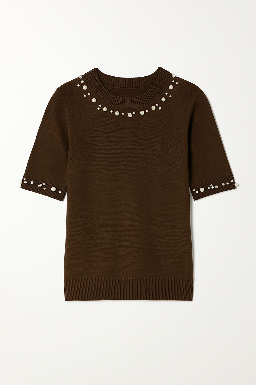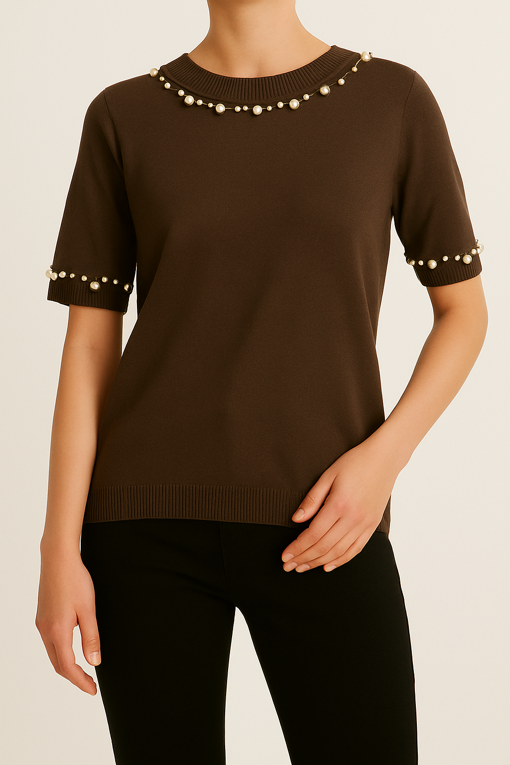 Κομψό σοκολατί πλεκτό μπλουζάκι με κοντό μανίκι, διακοσμημένο με πέρλες & στρας στο λαιμό και στα μανίκια. Θηλυκό, elegant και ιδανικό για chic καθημερινές και πιο ιδιαίτερες εμφανίσεις.