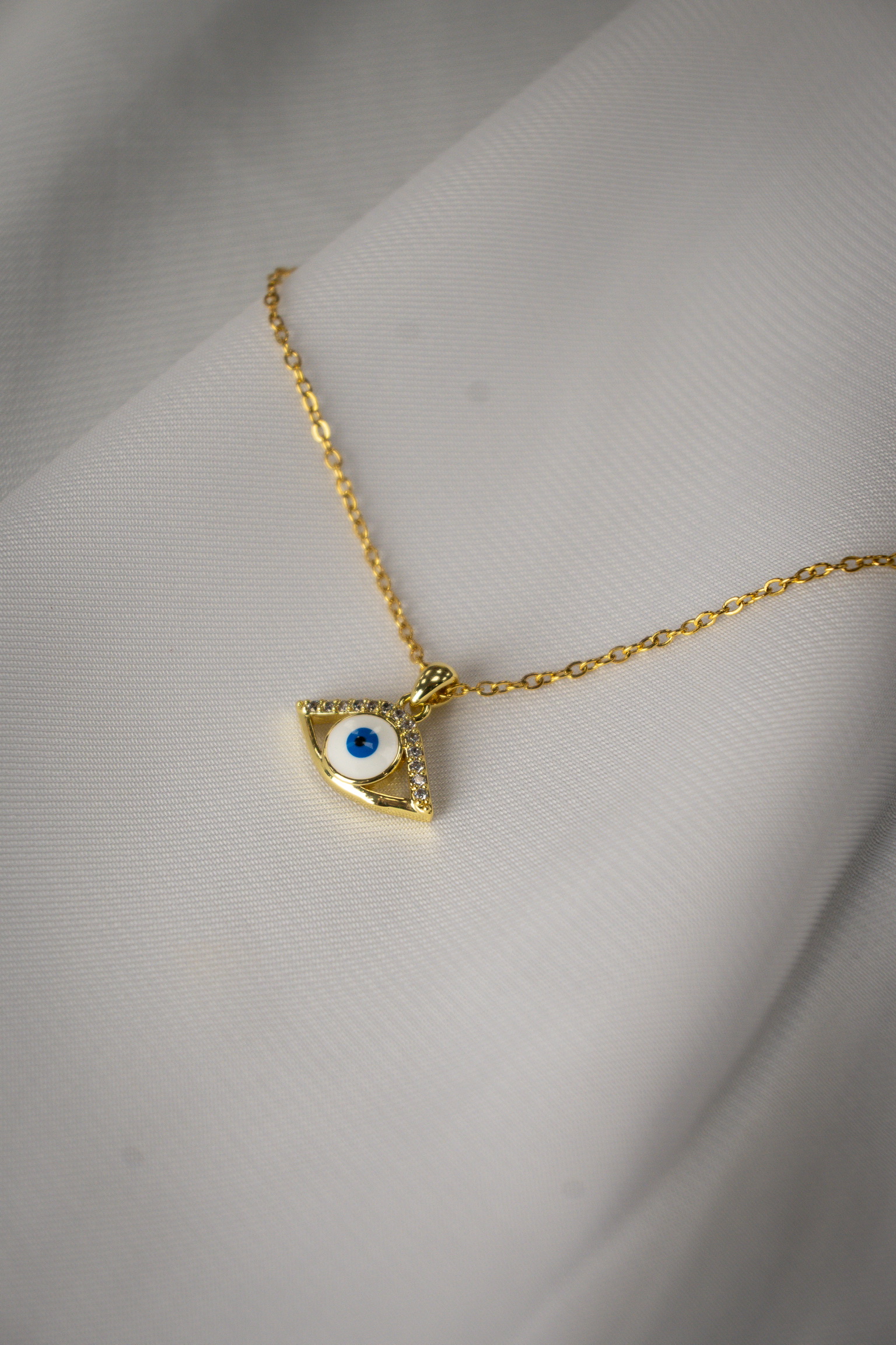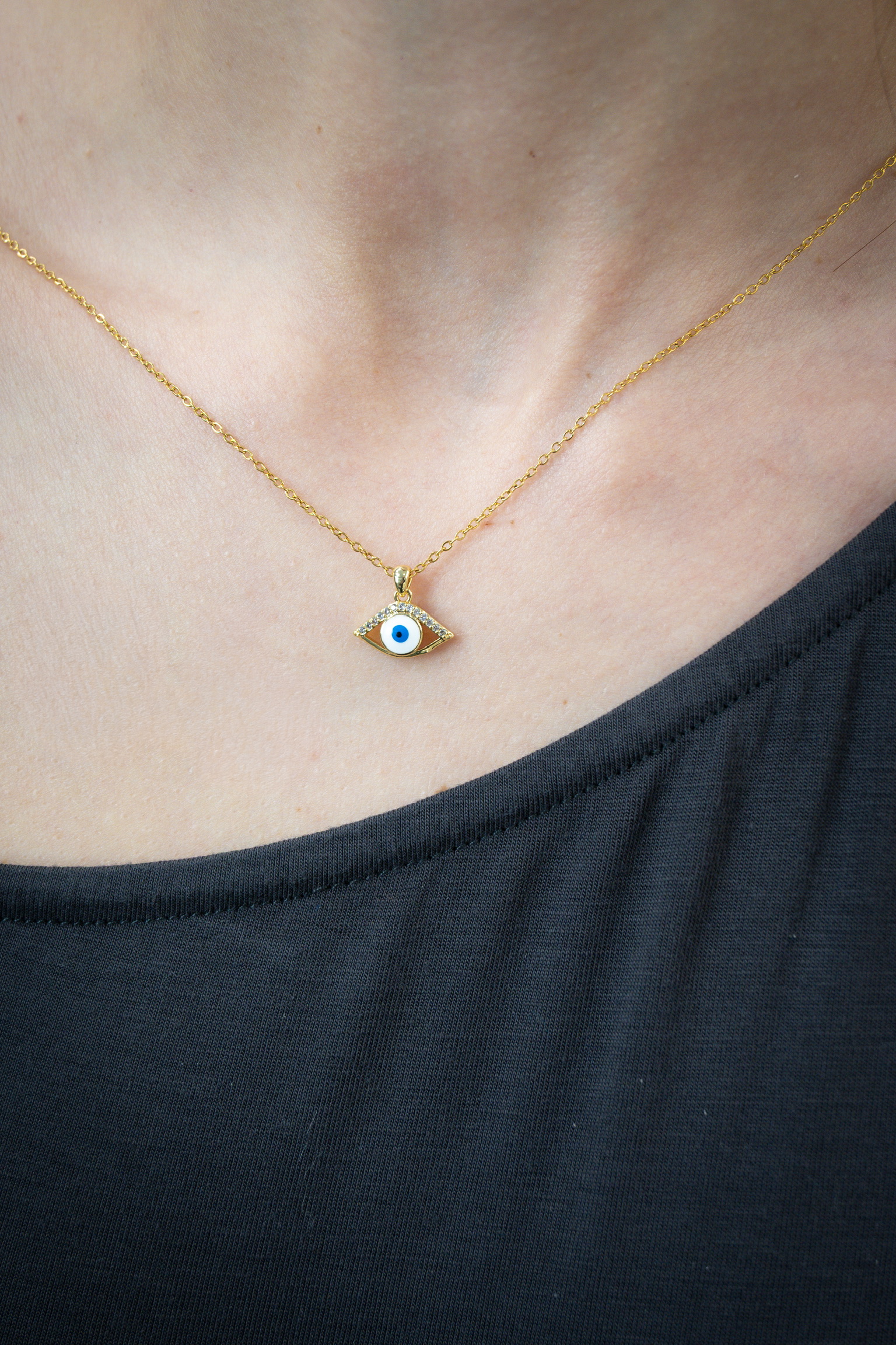 Κομψό κολιέ από ατσάλι με σχέδιο ματάκι και λαμπερά στρας, ιδανικό για καθημερινή προστασία και στιλ.