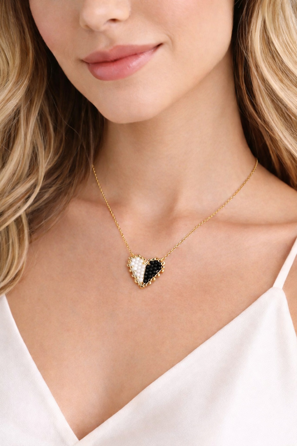 Χειροποίητο κολιέ με δίχρωμη καρδιά από λευκές και μαύρες χάντρες και λεπτή χρυσή αλυσίδα. Minimal και κομψό κόσμημα για κάθε στιγμή.