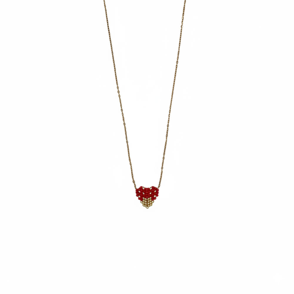 Χειροποίητο κολιέ με εντυπωσιακή καρδιά από μικροσκοπικές χάντρες σε ζεστό συνδυασμό κόκκινου και χρυσού χρώματος, που αποπνέει ρομαντισμό και διακριτική πολυτέλεια. Το κόκκινο συμβολίζει την αγάπη και το πάθος, ενώ η χρυσή βάση προσθέτει λάμψη και κομψότητα.