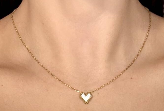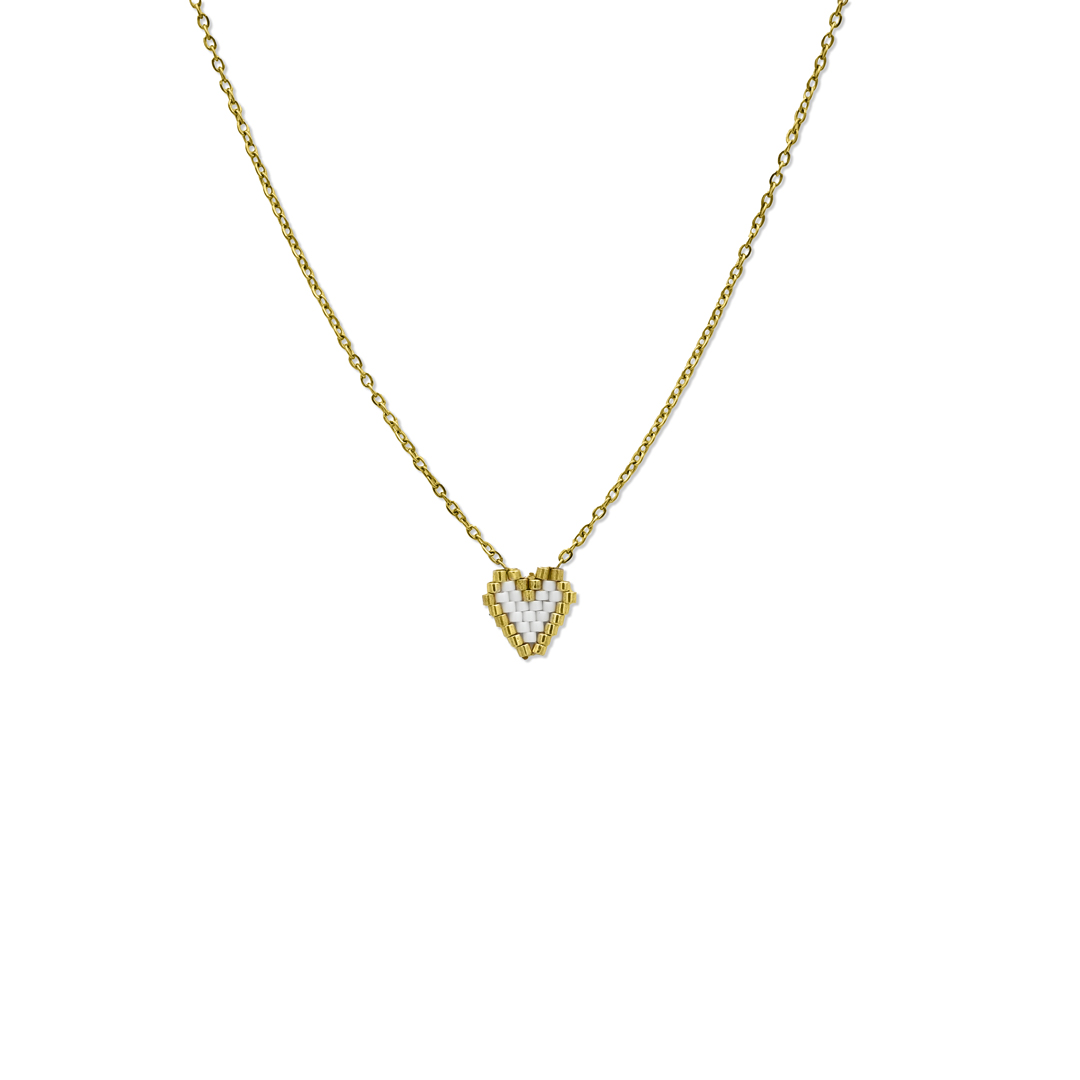 Κομψό και διακριτικό κολιέ με καρδιά, ιδανικό για καθημερινή χρήση αλλά και για ιδιαίτερες εμφανίσεις. Διαθέτει λεπτή αλυσίδα σε χρυσό τόνο και χειροποίητο μοτίφ καρδιάς από μικρές χάντρες σε λευκές και χρυσές αποχρώσεις, που δημιουργούν ένα minimal αλλά ταυτόχρονα ιδιαίτερο αποτέλεσμα.