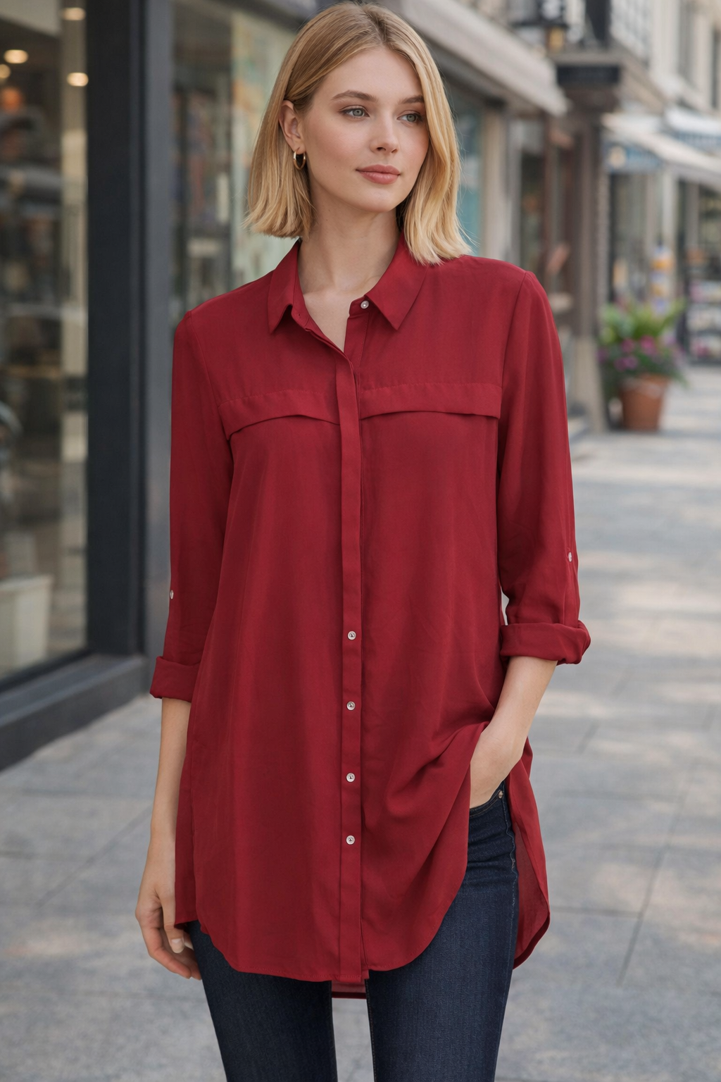 Κομψή μακριά μπορντό πουκαμίσα με κουμπιά και ρεβέρ μανίκια. Ιδανική για καθημερινές και πιο προσεγμένες εμφανίσεις, άνετη και ευκολοφόρετη.
