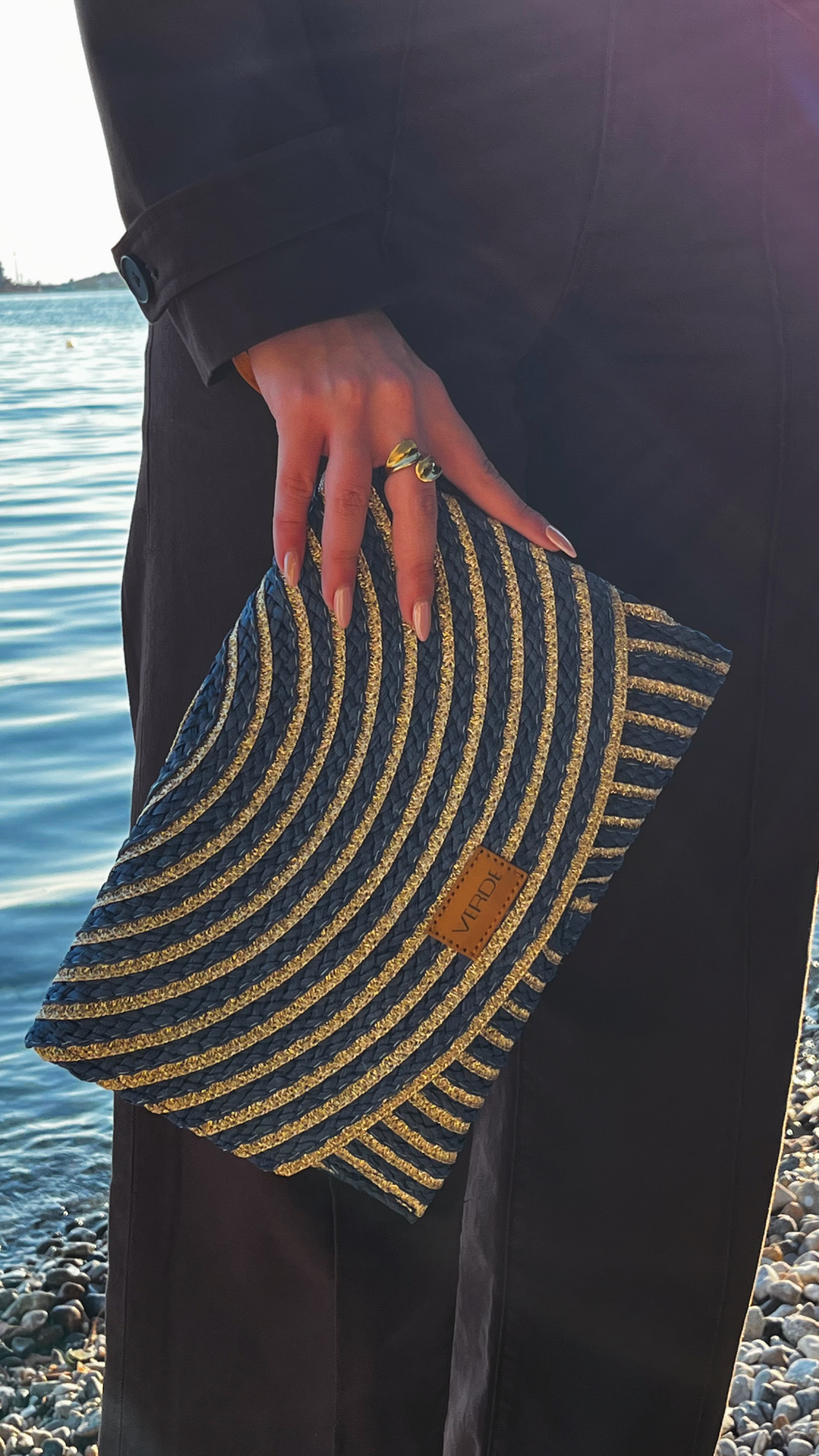 Κομψός μπλε ψάθινος φάκελος Verde με χρυσές λεπτομέρειες, ιδανικός για καλοκαιρινές και βραδινές εμφανίσεις.