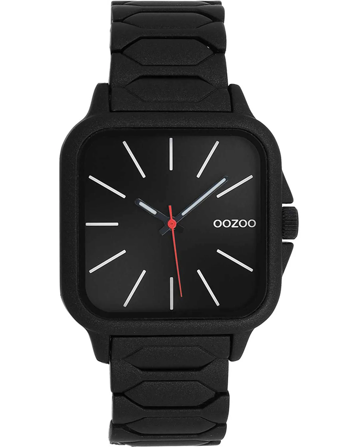 Minimal ανδρικό ρολόι OOZOO σε total black σχεδιασμό με τετράγωνο καντράν και κόκκινη λεπτοδείκτη για μοντέρνο και δυναμικό στυλ.