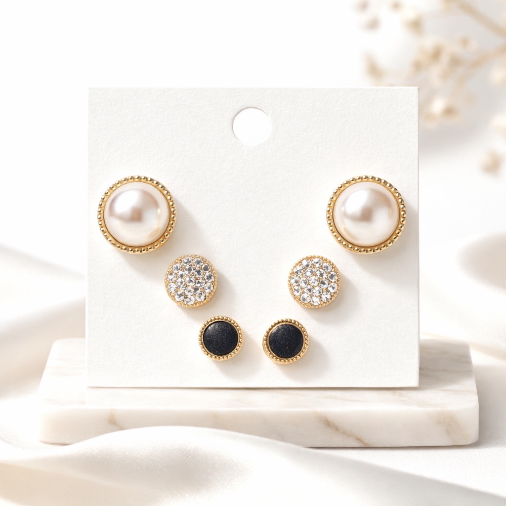 Αναβάθμισε τη συλλογή σου με αυτό το elegant σετ γυναικείων σκουλαρικιών που περιλαμβάνει 6 τεμάχια σε διαχρονικό και θηλυκό σχεδιασμό. Το σετ συνδυάζει πέρλες, λαμπερά κρύσταλλα και minimal μαύρες λεπτομέρειες, δημιουργώντας επιλογές που καλύπτουν κάθε στυλ και περίσταση.