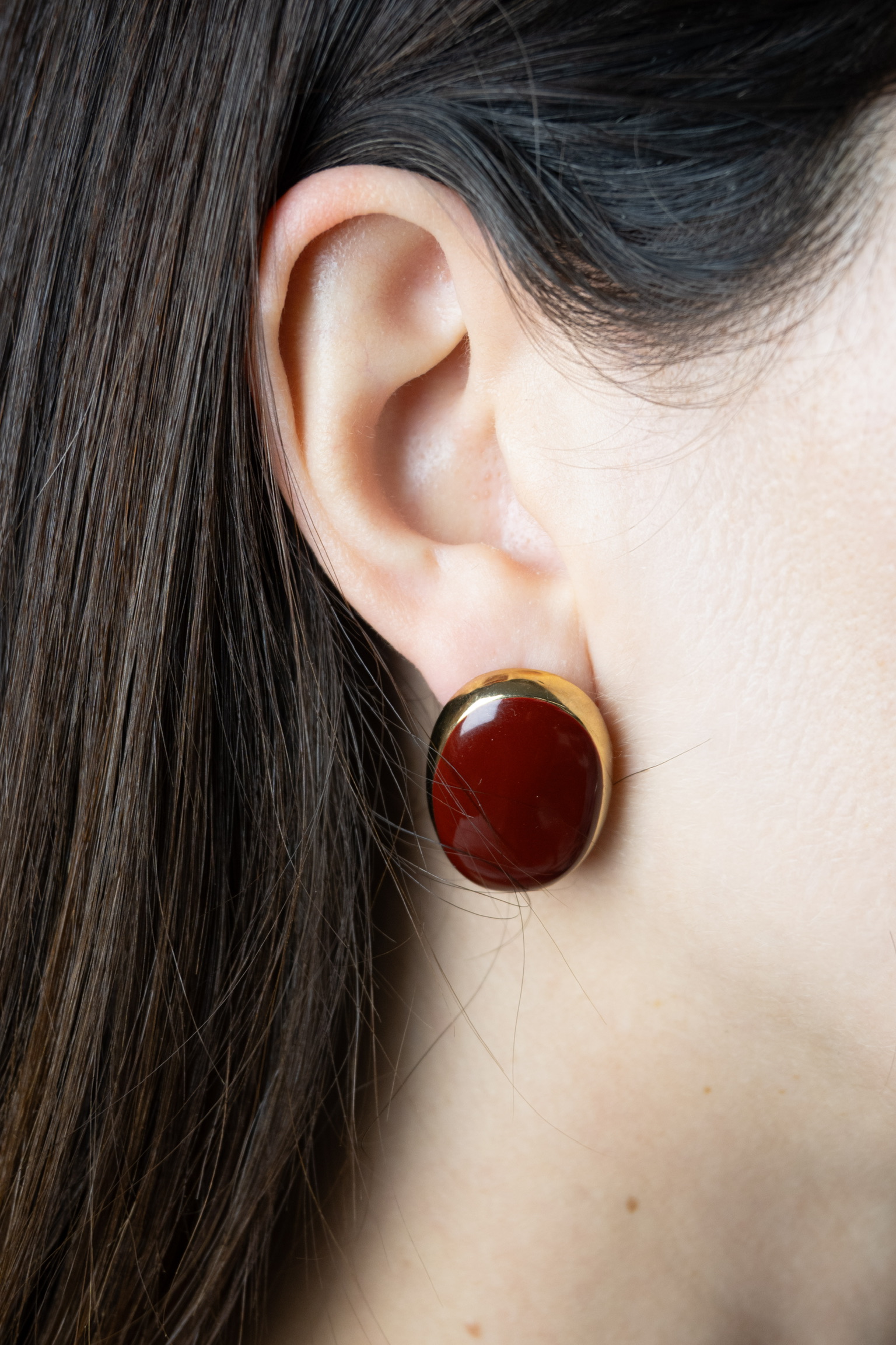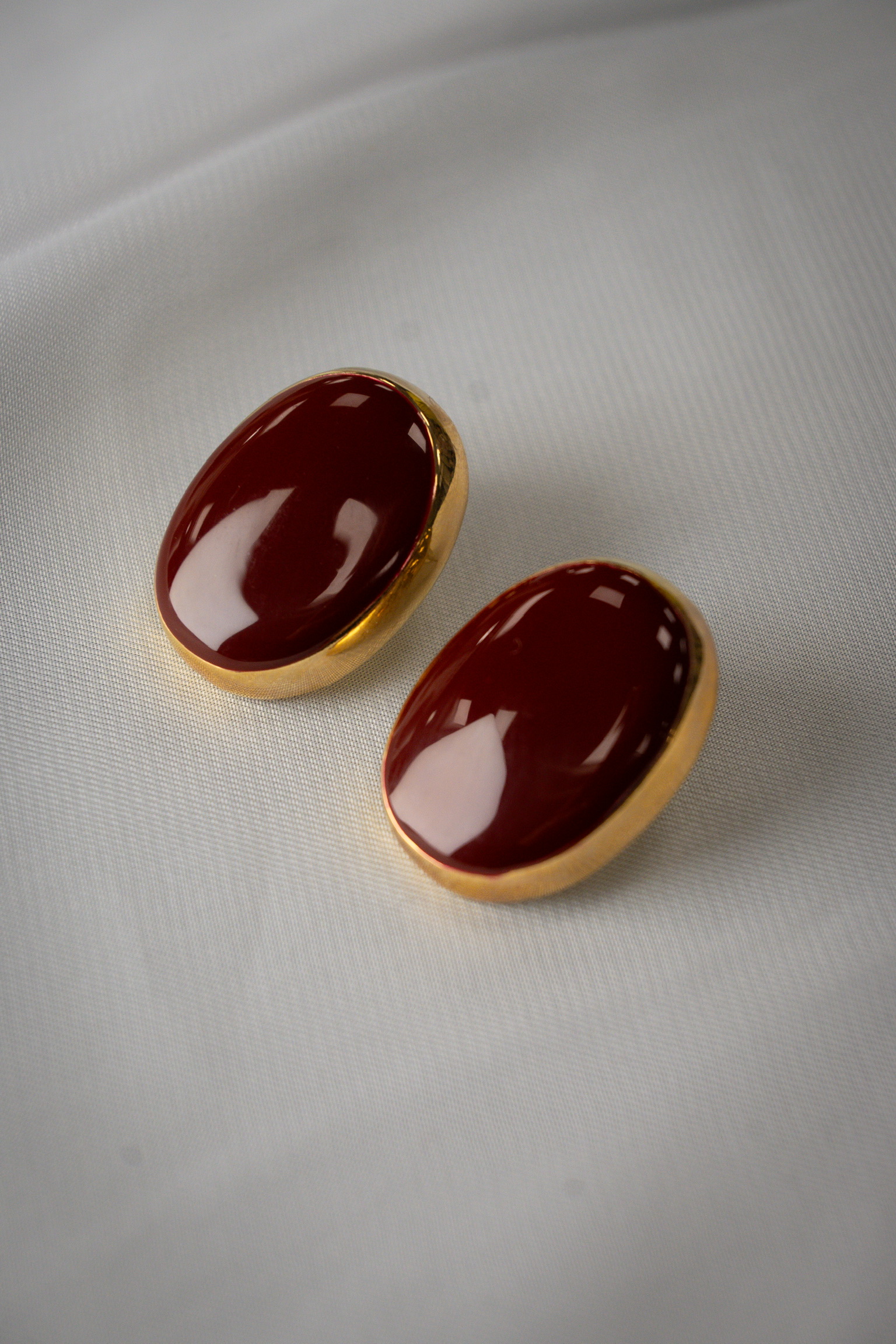 Κομψά και διαχρονικά σκουλαρίκια καρφωτά σε οβάλ σχήμα, με εντυπωσιακή μπορντό επιφάνεια και χρυσό περίγραμμα που χαρίζει πολυτέλεια σε κάθε εμφάνιση.