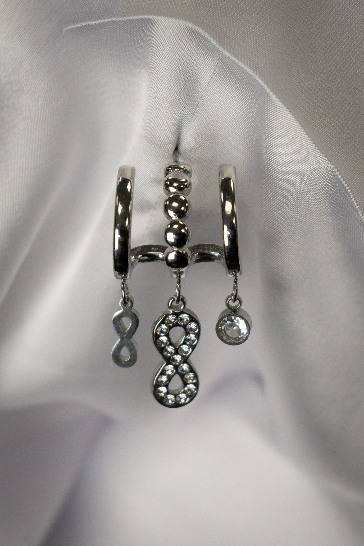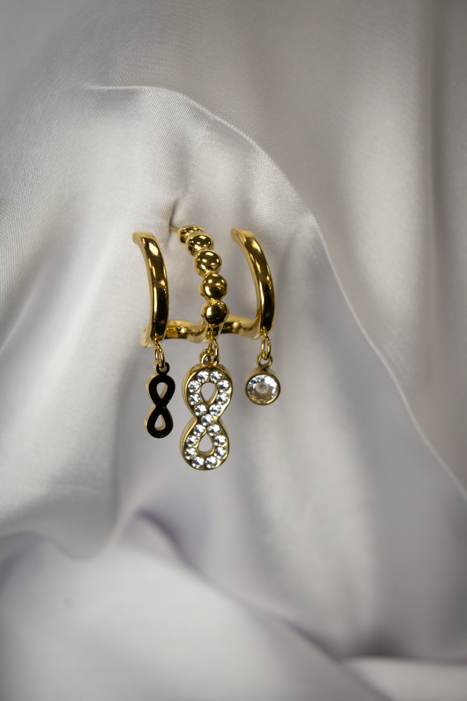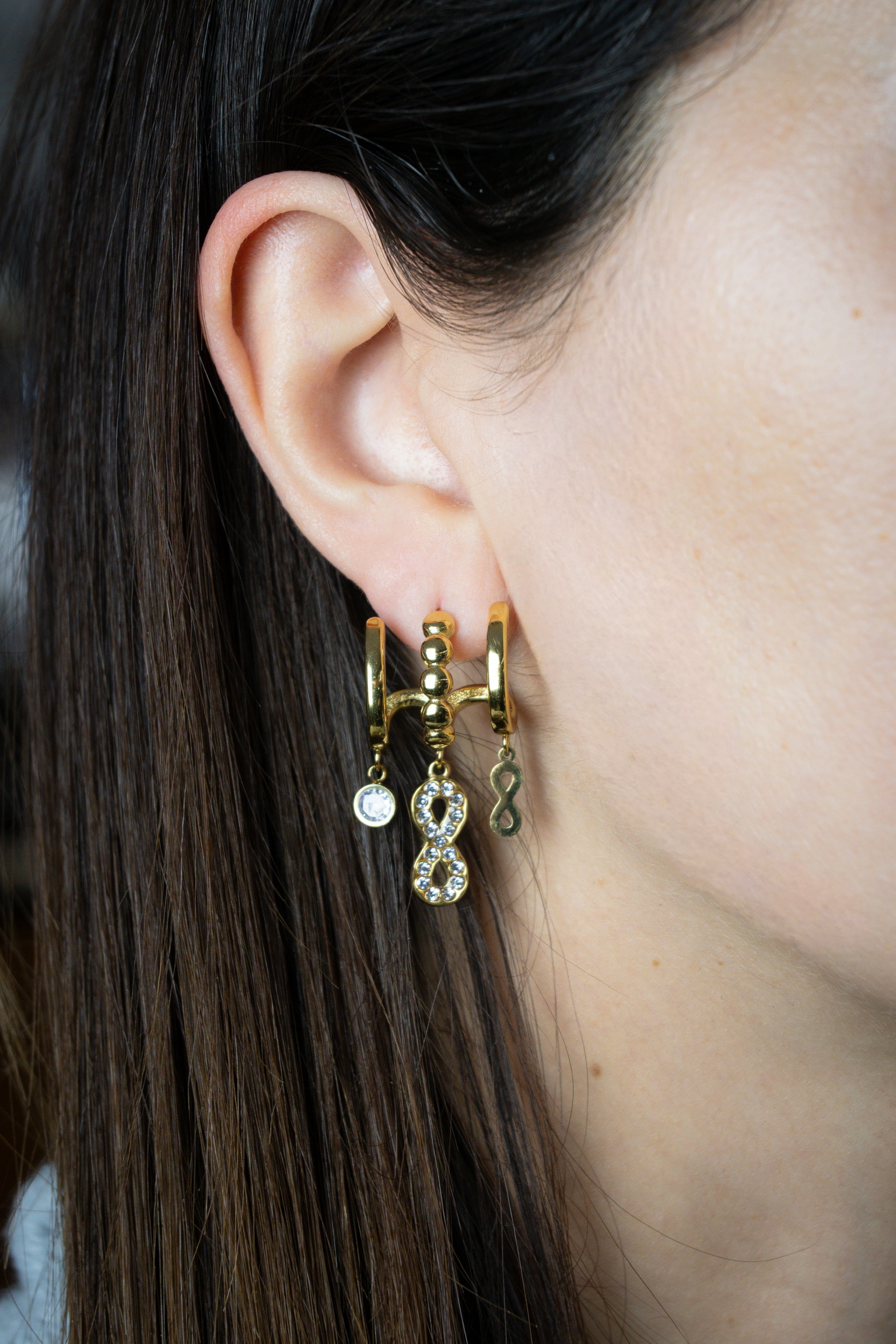 Μοντέρνοι και κομψοί ατσάλινοι κρίκοι με κρεμαστές λεπτομέρειες που συνδυάζουν το διαχρονικό σύμβολο του απείρου με λαμπερές πέτρες. Το ατσάλι εξασφαλίζει αντοχή και άνεση, ενώ το λαμπερό στοιχείο δίνει μία elegant πινελιά. Ιδανικά για καθημερινή χρήση αλλά και για πιο ξεχωριστές περιστάσεις.
