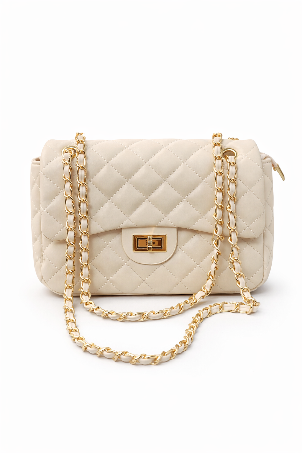 Καπιτονέ μπεζ τσάντα ώμου με χρυσή αλυσίδα και μεταλλικό κούμπωμα. Κομψή και πρακτική για καθημερινές και βραδινές εμφανίσεις.