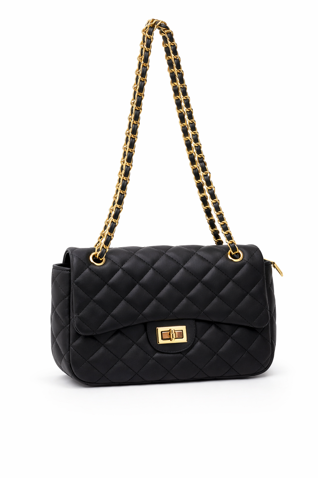 Καπιτονέ μαύρη τσάντα ώμου με χρυσή αλυσίδα και μεταλλικό κούμπωμα. Κομψή και πρακτική επιλογή για κάθε εμφάνιση.