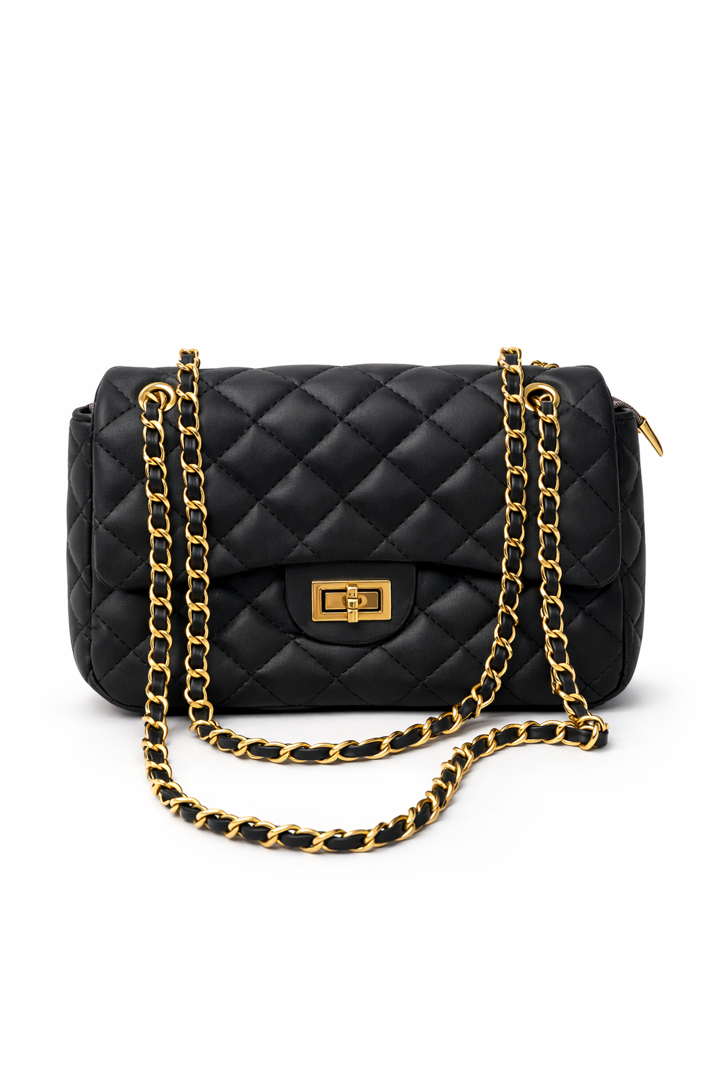 Κομψή καπιτονέ τσάντα ώμου σε διαχρονικό μαύρο χρώμα που προσθέτει στυλ και φινέτσα σε κάθε εμφάνιση. Η χρυσή αλυσίδα με δερμάτινη πλέξη χαρίζει πολυτελή αισθητική και επιτρέπει να φορεθεί άνετα στον ώμο ή χιαστί. Το μεταλλικό κούμπωμα στο μπροστινό μέρος ολοκληρώνει το design προσφέροντας ασφάλεια και κομψότητα.