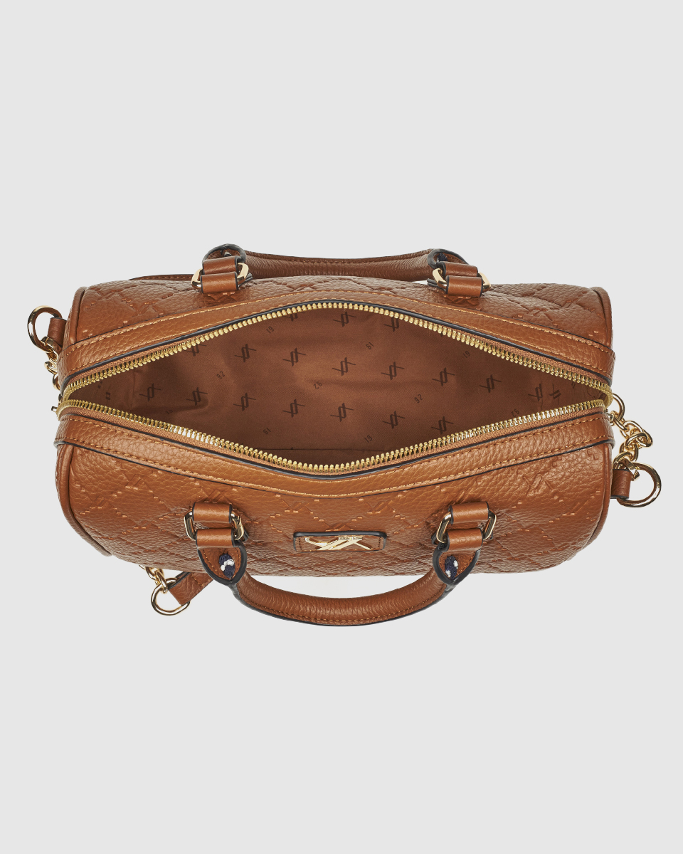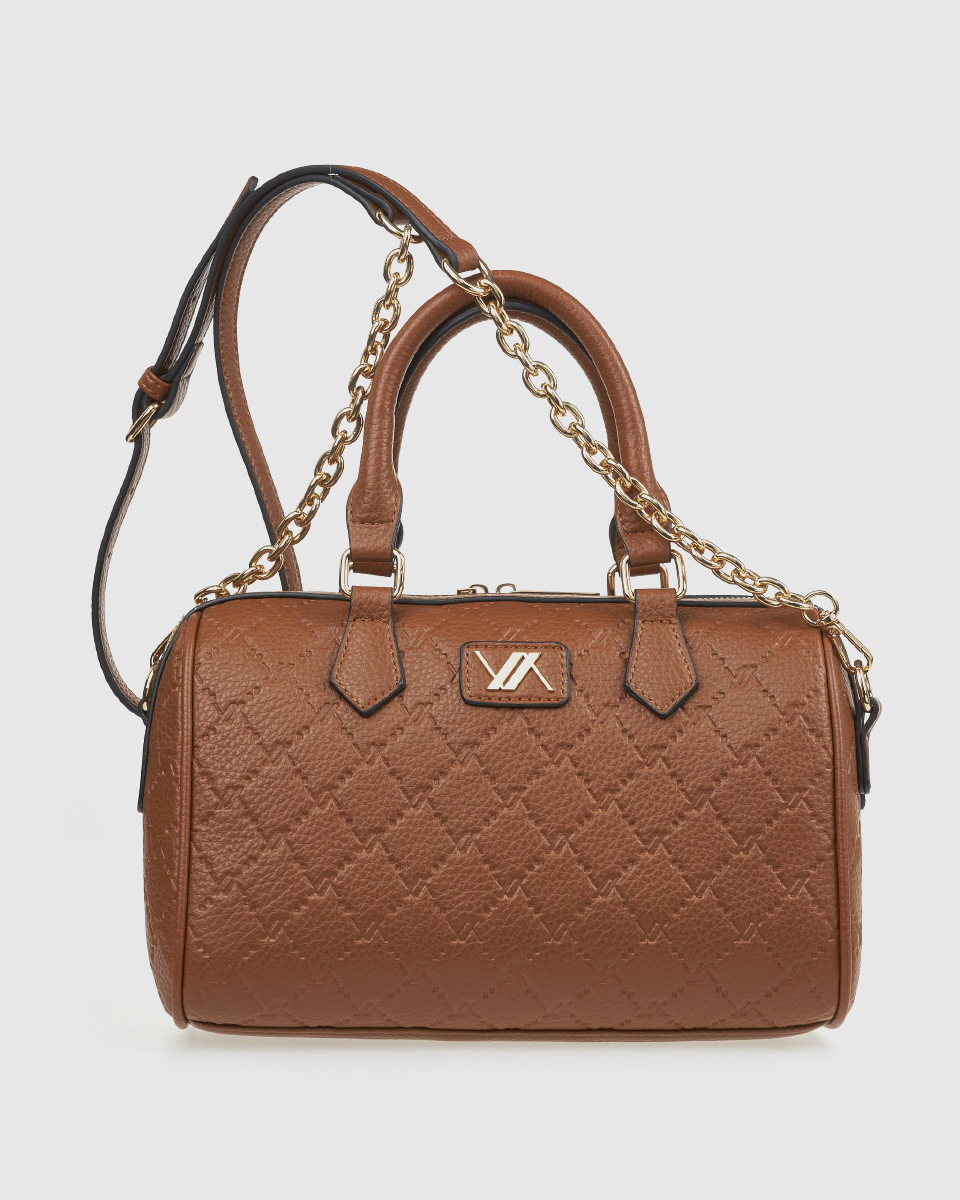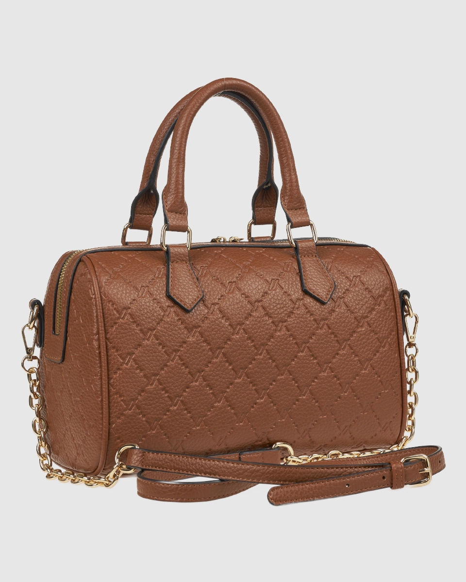 Γυναικεία τσάντα χειρός σε κομψό καφέ χρώμα, που συνδυάζει κομψότητα και πρακτικότητα. Κατασκευασμένη από ποιοτικό συνθετικό δέρμα με ανάγλυφο καπιτονέ σχέδιο, προσδίδει πολυτελή εμφάνιση σε κάθε σύνολο. Διαθέτει διπλά χερούλια για κράτημα στο χέρι, αποσπώμενο και ρυθμιζόμενο λουρί ώμου, καθώς και διακοσμητική μεταλλική αλυσίδα σε χρυσό τόνο για extra στιλ. Το ευρύχωρο εσωτερικό της προσφέρει άνεση στην οργάνωση των προσωπικών αντικειμένων, ενώ το μεταλλικό λογότυπο στο μπροστινό μέρος ολοκληρώνει τον μοντέρνο σχεδιασμό της. Ιδανική επιλογή για καθημερινές αλλά και πιο κομψές εμφανίσεις