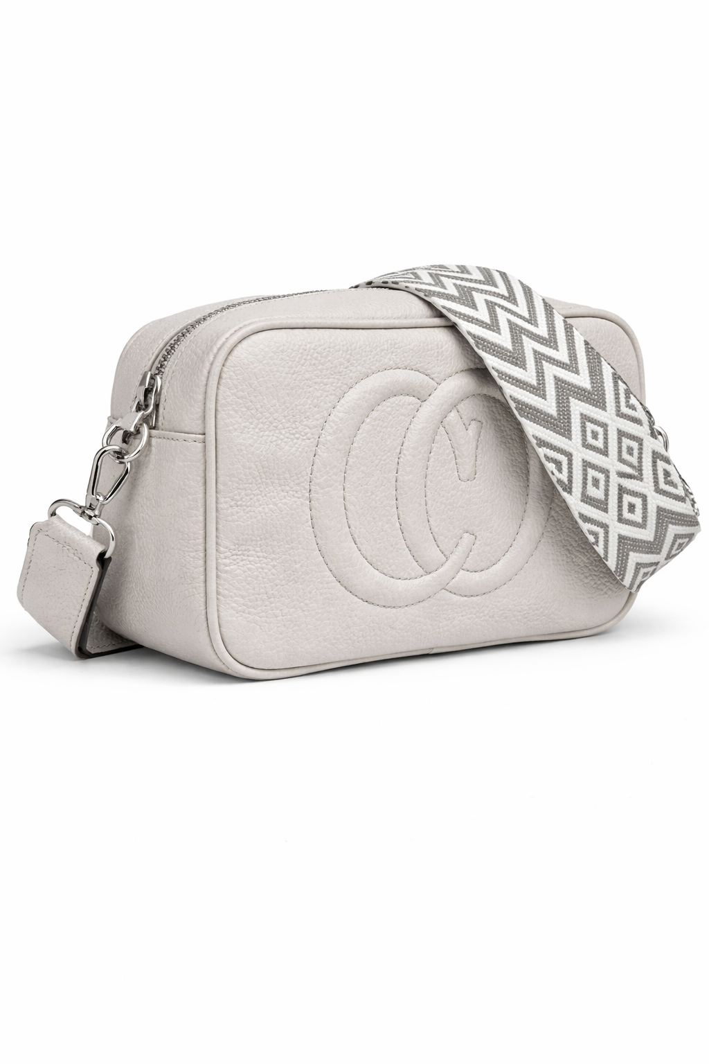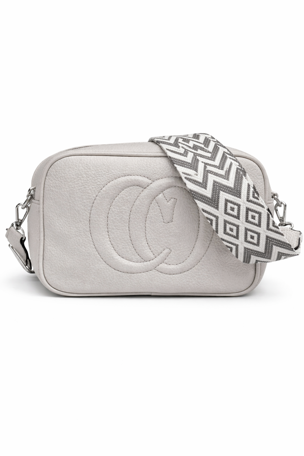 Γκρι τσάντα χιαστί με ανάγλυφο σχέδιο και φαρδιά ρυθμιζόμενη λουρά. Ιδανική για άνετες και κομψές καθημερινές εμφανίσεις.