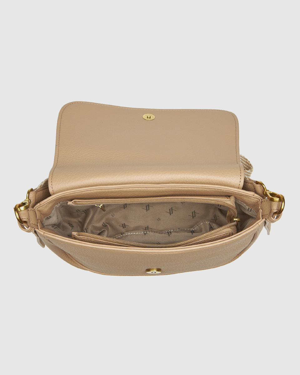 Κομψή γυναικεία τσάντα χιαστί σε μπεζ απόχρωση με μοντέρνο σχεδιασμό και ρυθμιζόμενο ιμάντα. Ιδανική για καθημερινή χρήση, προσφέροντας άνεση, πρακτικότητα και στυλ σε κάθε εμφάνιση.