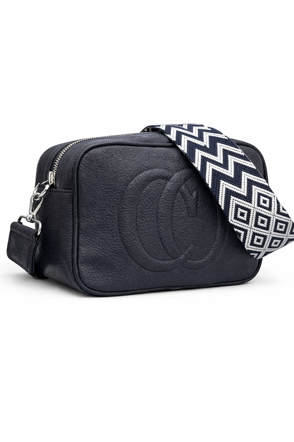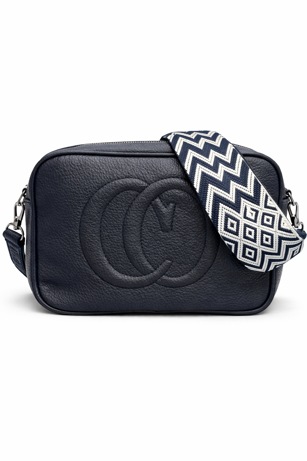 Κομψή τσάντα χιαστί σε διαχρονική μπλε απόχρωση που συνδυάζει minimal αισθητική και πρακτικότητα. Το ανάγλυφο διακοσμητικό σχέδιο στο μπροστινό μέρος προσθέτει μια διακριτική πολυτελή πινελιά, ενώ η φαρδιά υφασμάτινη λουρά με μοτίβο εξασφαλίζει άνετη εφαρμογή και μοντέρνο στυλ.
