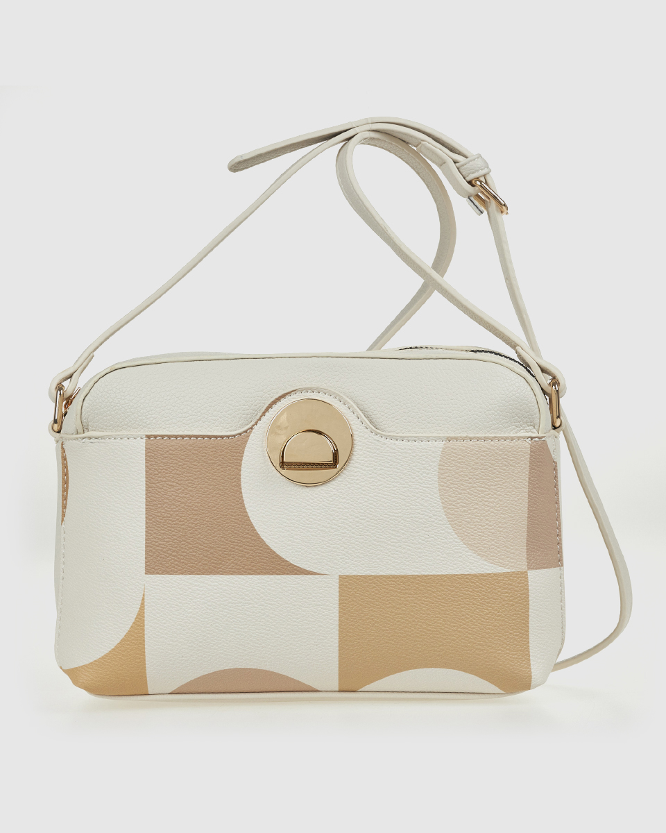 Κομψή γυναικεία τσάντα χιαστί σε εκρού απόχρωση με μοντέρνο γεωμετρικό σχέδιο και χρυσό μεταλλικό κούμπωμα. Ιδανική για καθημερινές και βραδινές εμφανίσεις.