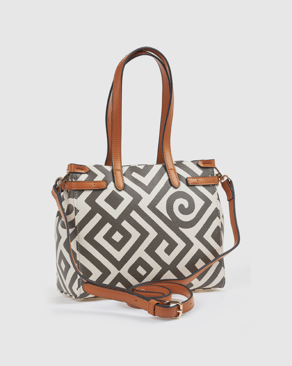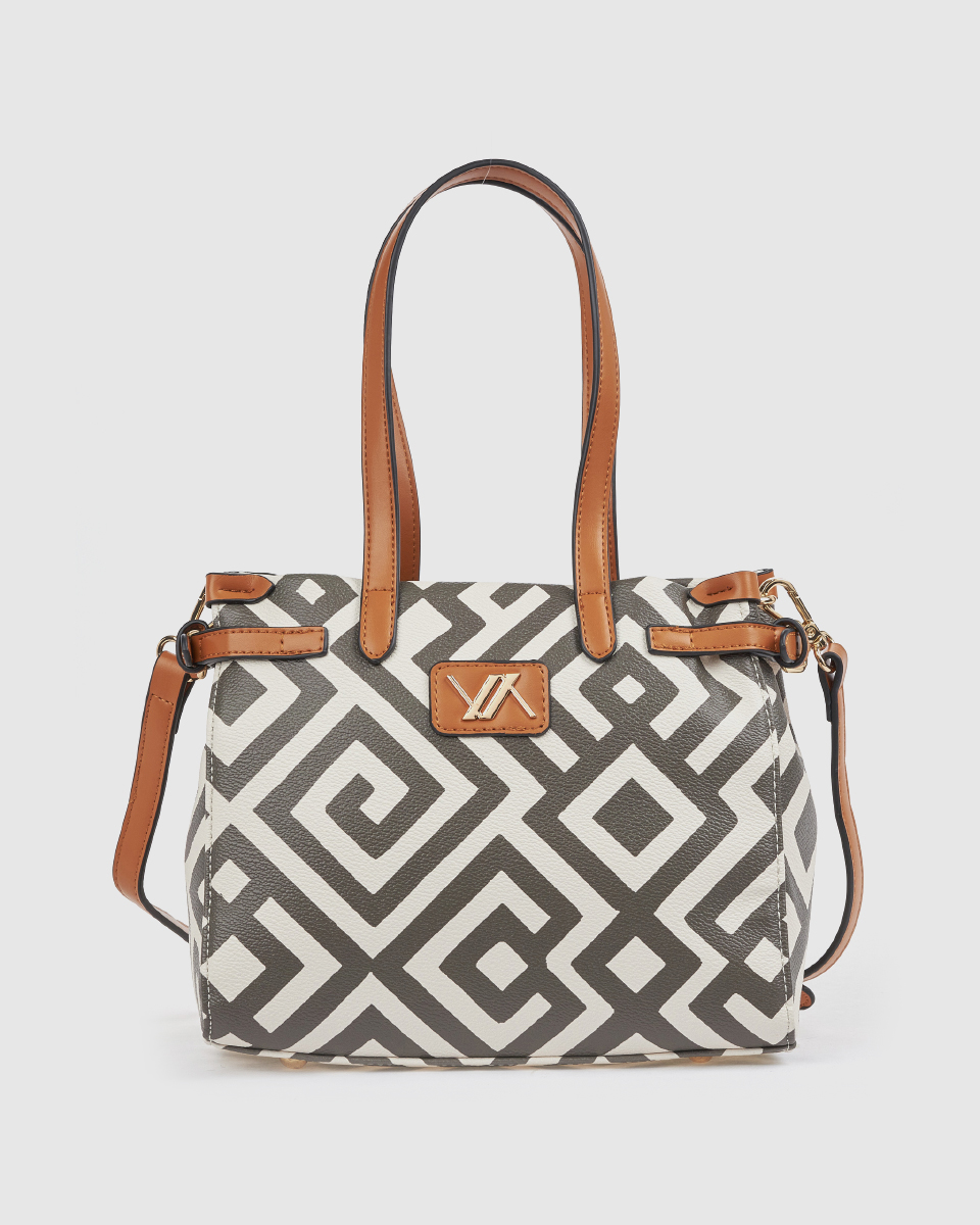 Κομψή γυναικεία τσάντα ώμου με γεωμετρικό μοτίβο, ταμπά λεπτομέρειες και αποσπώμενο λουράκι για χιαστί χρήση. Ιδανική για καθημερινές εμφανίσεις με στυλ.