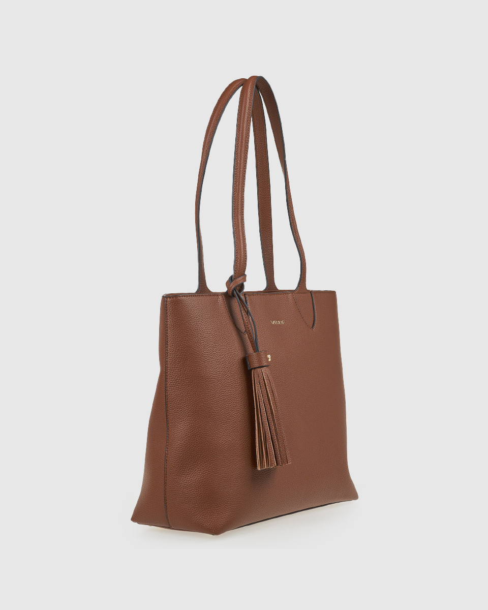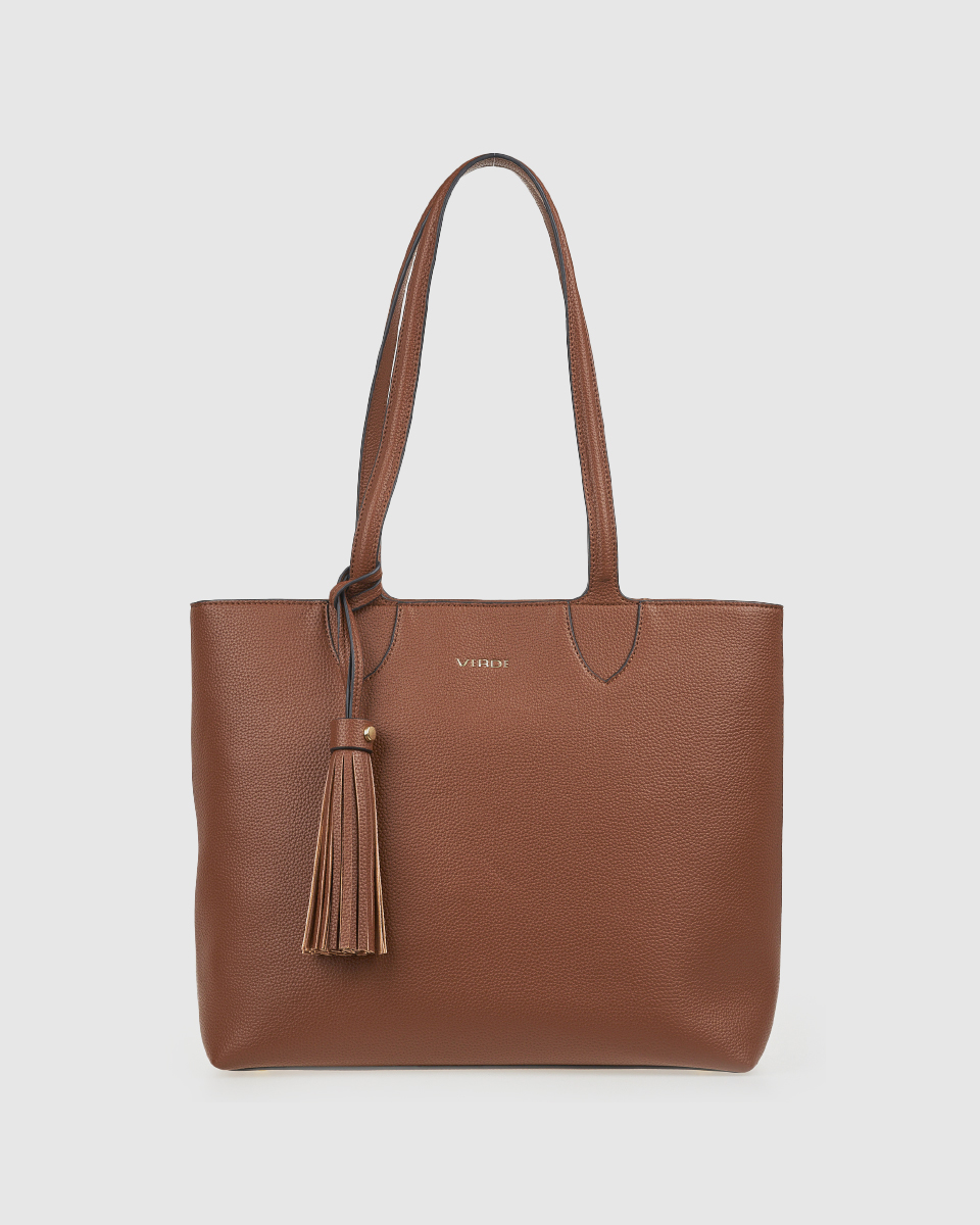 Κομψή γυναικεία τσάντα ώμου τύπου tote της εταιρείας VERDE σε καφέ καμηλό απόχρωση με ανάγλυφη υφή, που συνδυάζει διαχρονικό στυλ και πρακτικότητα για κάθε στιγμή της ημέρας. Ο minimal σχεδιασμός της με διακριτικό λογότυπο στο μπροστινό μέρος και διακοσμητική φούντα προσδίδει κομψότητα και θηλυκό χαρακτήρα, καθιστώντας την ιδανική επιλογή για το γραφείο, τις καθημερινές μετακινήσεις και τις αγορές.