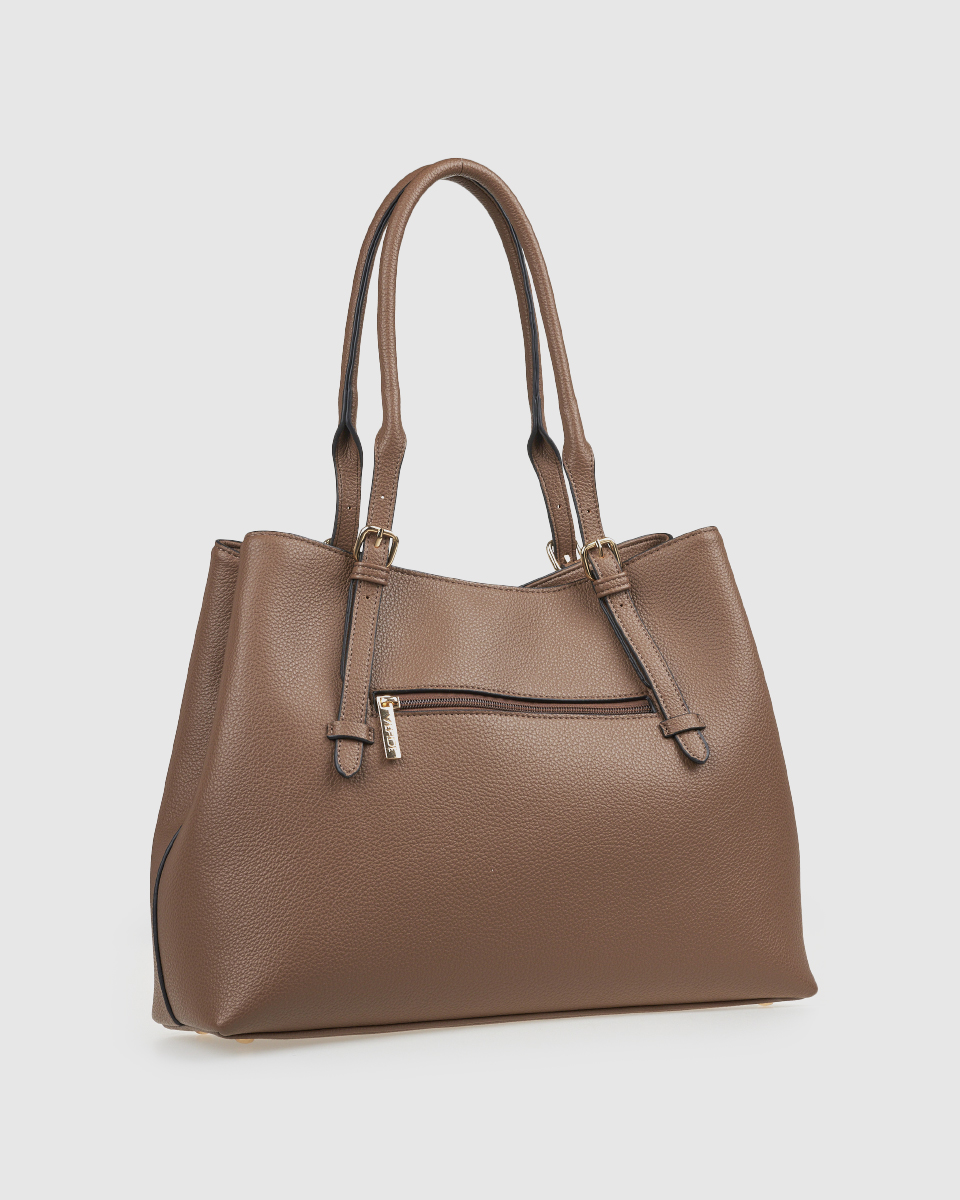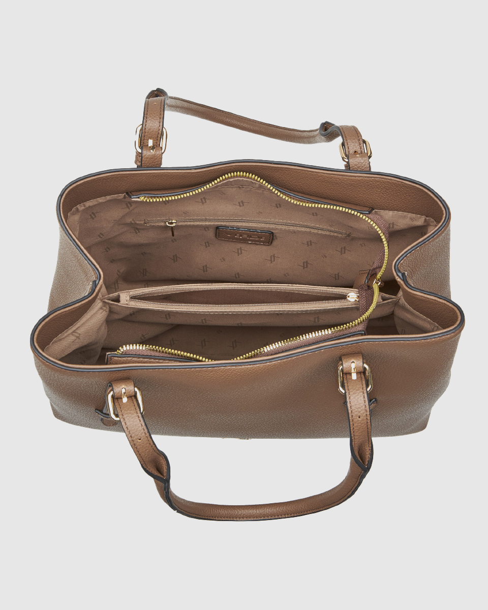 Το εσωτερικό της είναι οργανωμένο με ευρύχωρο κεντρικό χώρο, κεντρική θήκη με φερμουάρ που χωρίζει το εσωτερικό σε δύο τμήματα, καθώς και εσωτερική τσέπη με φερμουάρ και θήκες οργάνωσης, προσφέροντας άνετη μεταφορά εγγράφων, tablet και καθημερινών αντικειμένων. Το ποιοτικό συνθετικό δέρμα με ανάγλυφη υφή εξασφαλίζει αντοχή και πολυτελές αποτέλεσμα, ενώ οι μεταλλικές λεπτομέρειες σε χρυσό τόνο ολοκληρώνουν το εκλεπτυσμένο design.