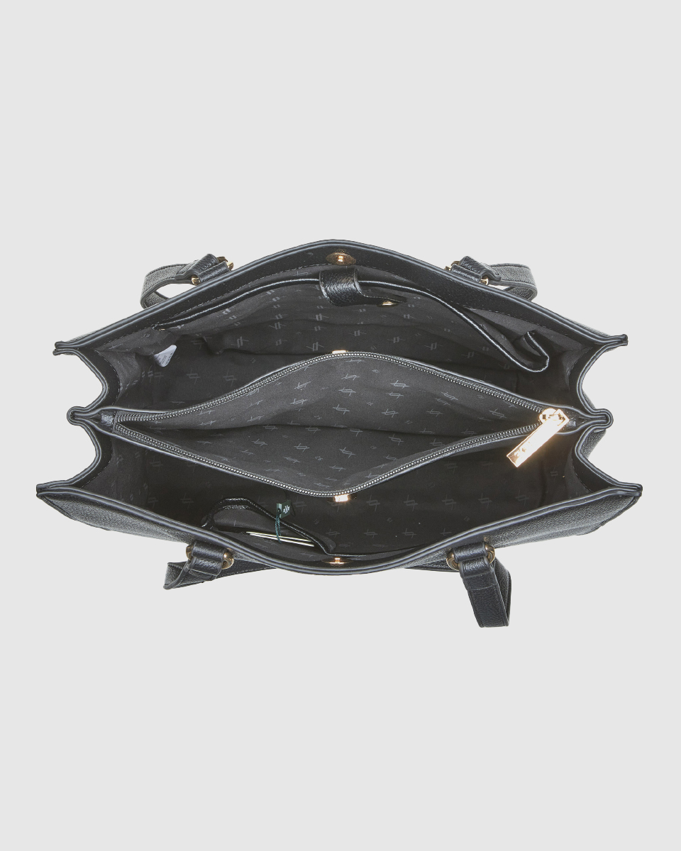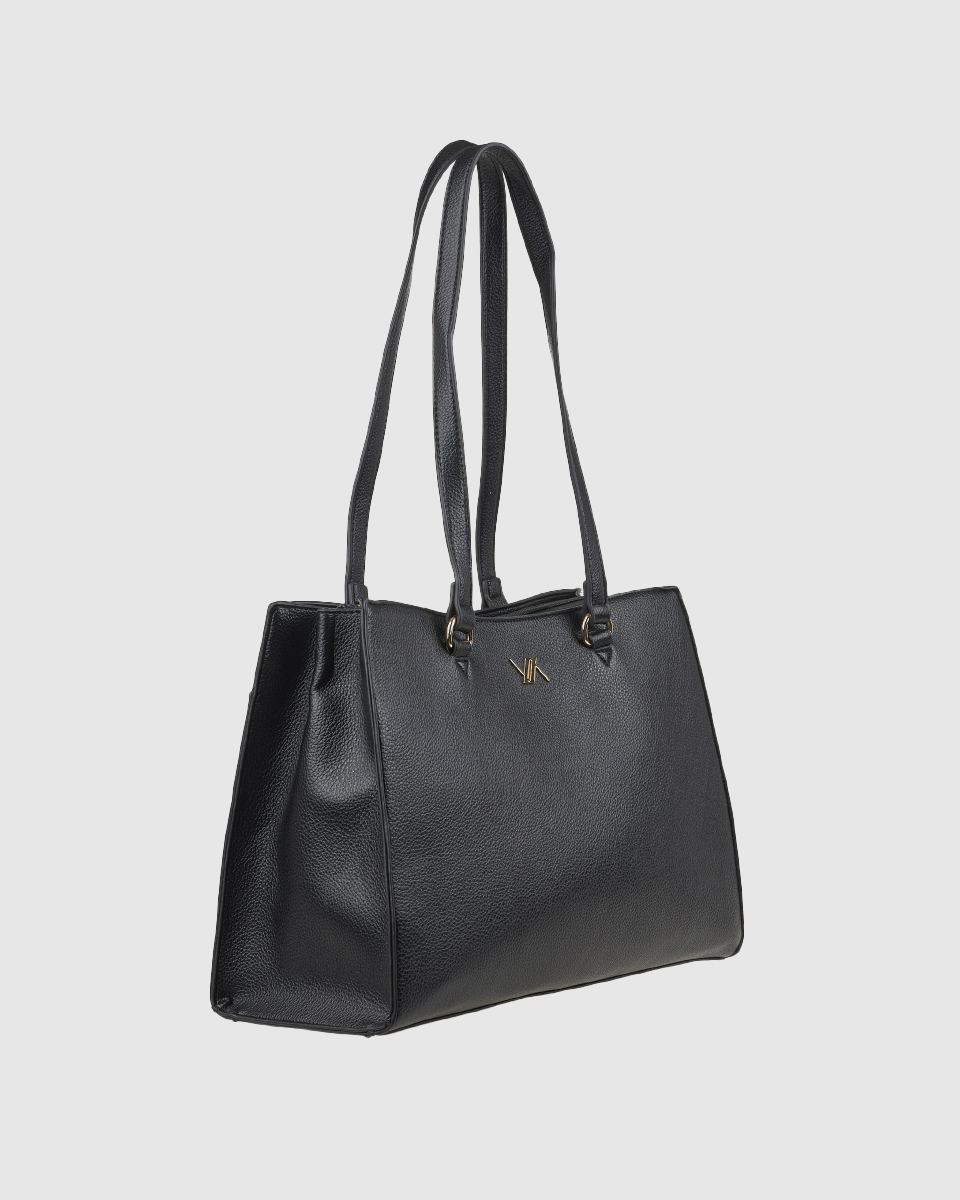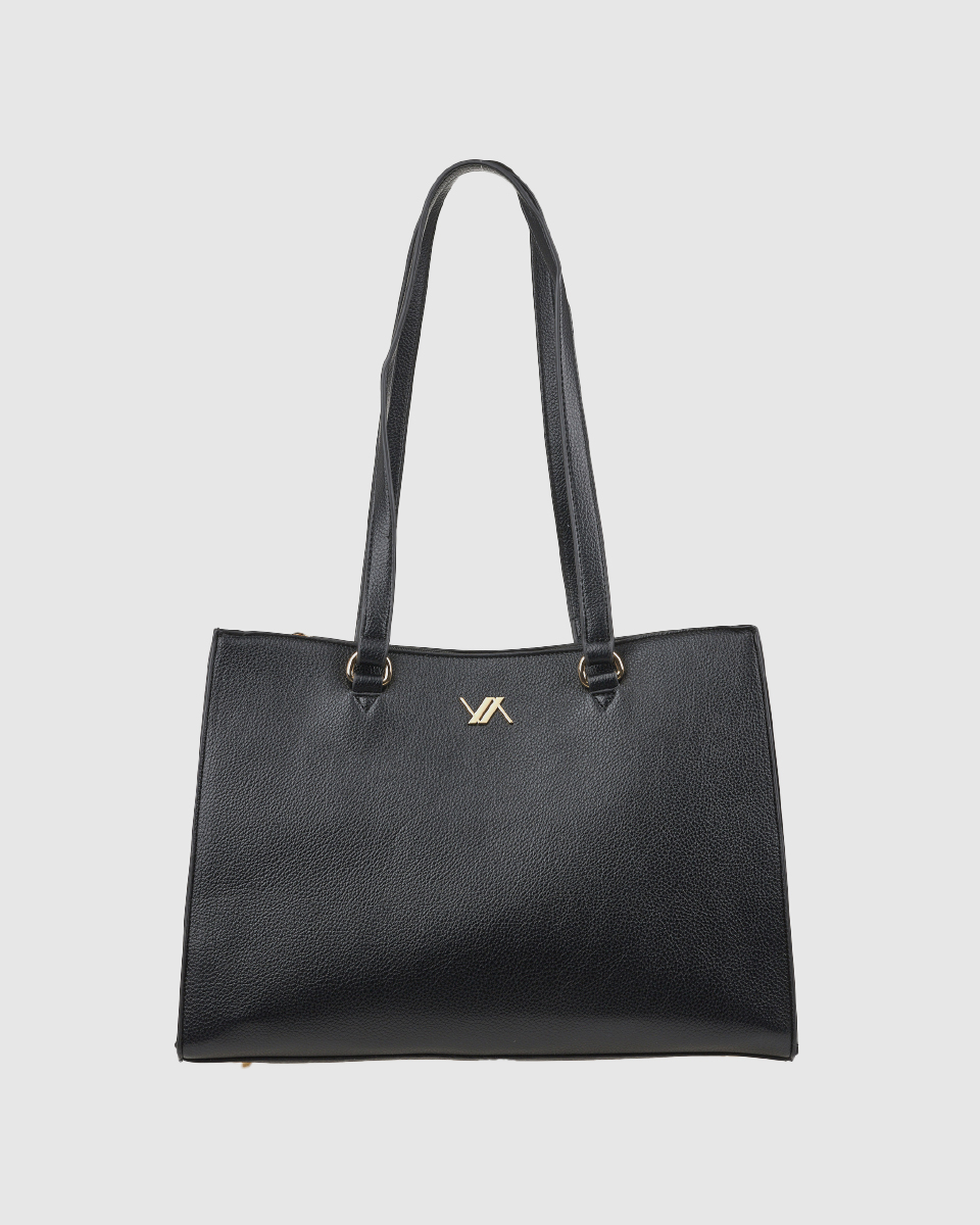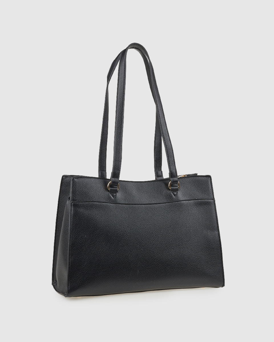 Κομψή και ευρύχωρη γυναικεία τσάντα ώμου σε μαύρο χρώμα, σχεδιασμένη για να καλύπτει άνετα τις ανάγκες της καθημερινότητας αλλά και του επαγγελματικού σας στυλ. Ο καθαρός, minimal σχεδιασμός με διακριτικό μεταλλικό λογότυπο μπροστά προσδίδει διαχρονική κομψότητα, ενώ οι σταθερές διπλές λαβές ώμου εξασφαλίζουν άνετη μεταφορά.