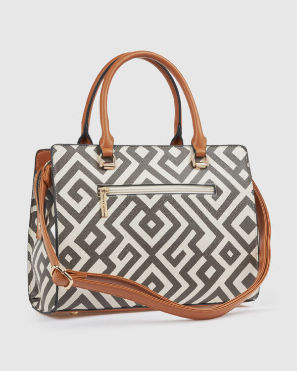 Κομψή γυναικεία τσάντα χειρός με γεωμετρικό σχέδιο σε ουδέτερους τόνους και ταμπά λεπτομέρειες. Διαθέτει αποσπώμενο λουράκι για χρήση και χιαστί.