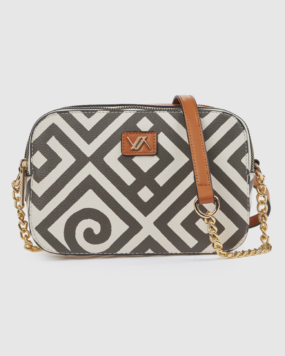 Μοντέρνα γυναικεία τσάντα χιαστί με γεωμετρικό σχέδιο, ταμπά λεπτομέρειες και χρυσή αλυσίδα. Ιδανική για καθημερινές και βραδινές εμφανίσεις.
